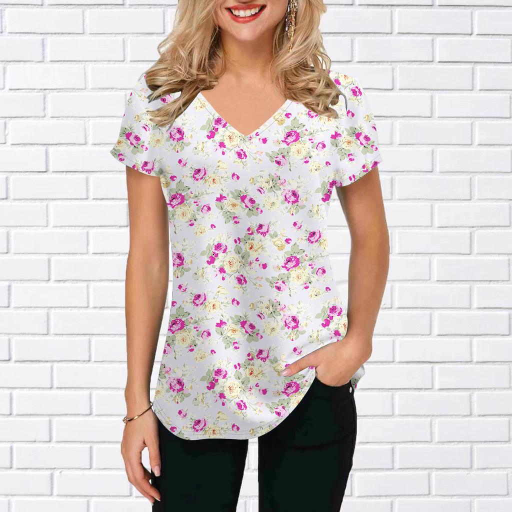 Женская футболка с V-образным вырезом и коротким рукавом с принтом подсолнухов, синего и цветочного моря, свободная повседневная блузка
