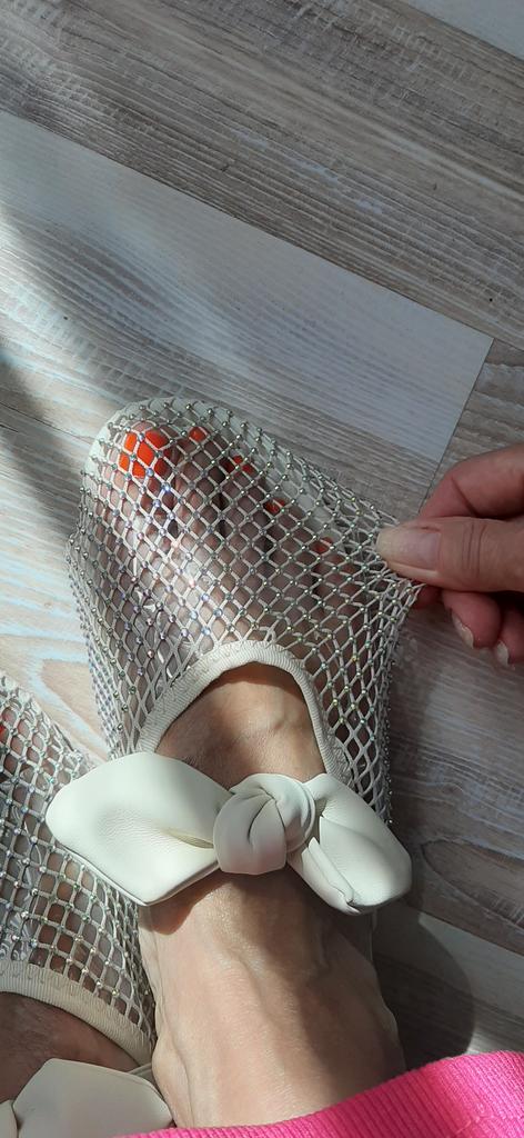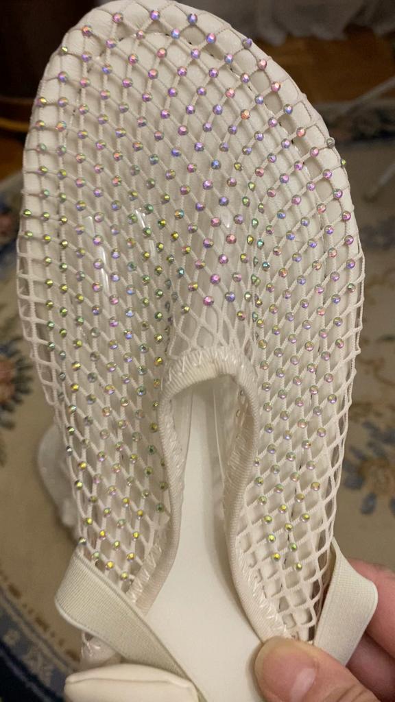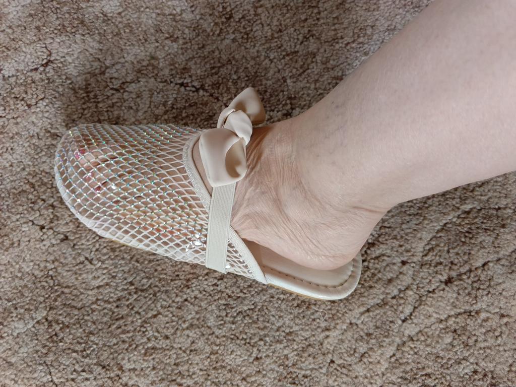 Очень понравились эти женские тапочки-шлепанцы в сеточку, украшенную многочисленными стразиками , переливающимися цветами радуги. На мою ступню с большим подъемом длиной 24,5 см и шириной 24 см я заказала 39 размер, он подошел идеально. Сеточка изнутри укреплена специальным прозрачным материалом, не доходящим до мыска (на мыске только сеточка), соприкосновение этого материала со ступней комфортное. Для того чтобы шлепанцы при ходьбе не спадали с ног, имеется резинка, украшенная бантиком из экокожи. Подошва прорезиненная с каблучком около 1 см. Качество изготовления хорошее. Рекомендую.