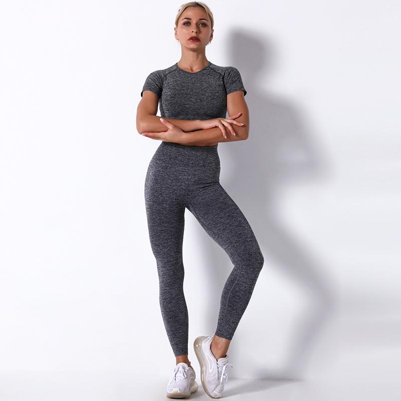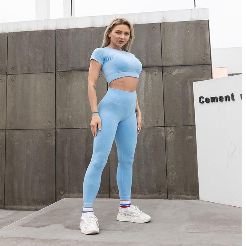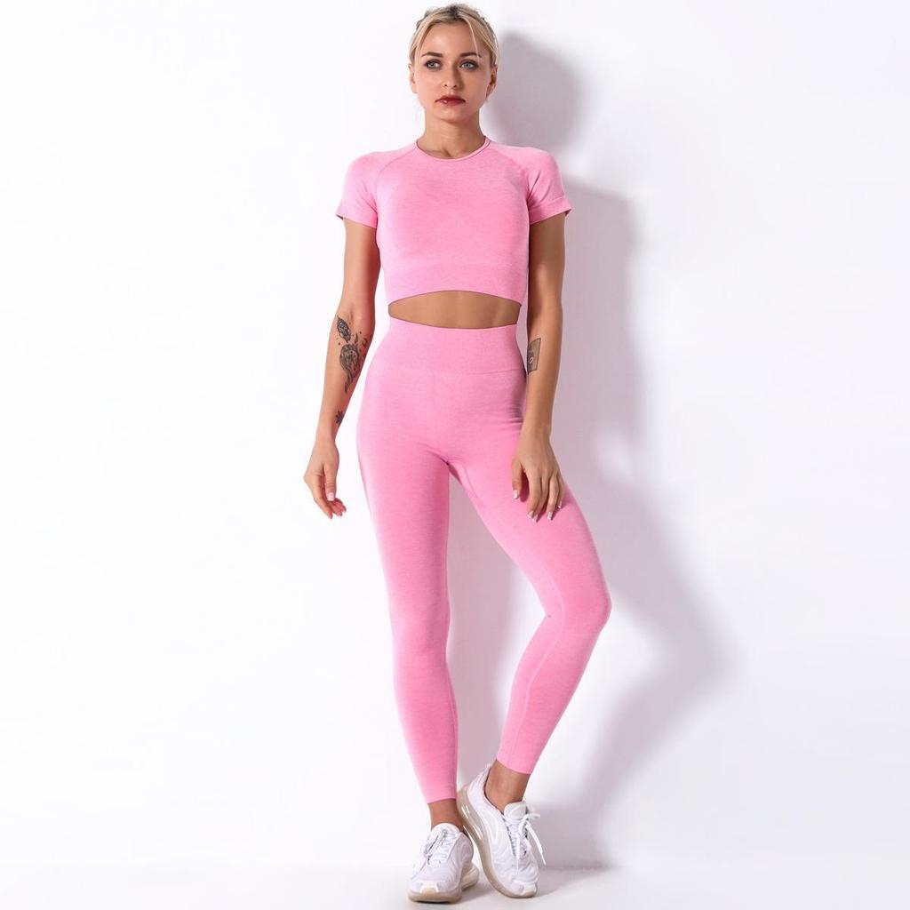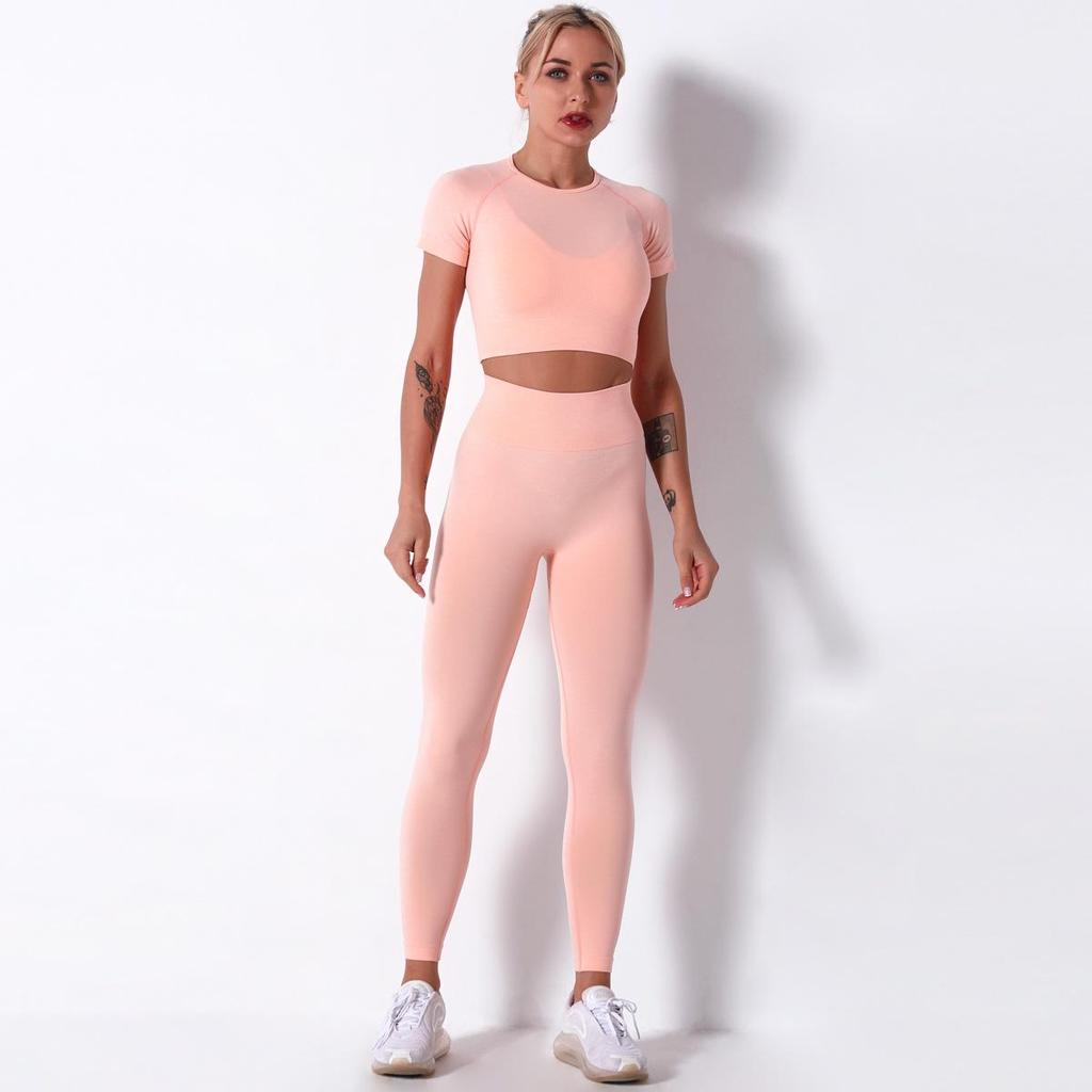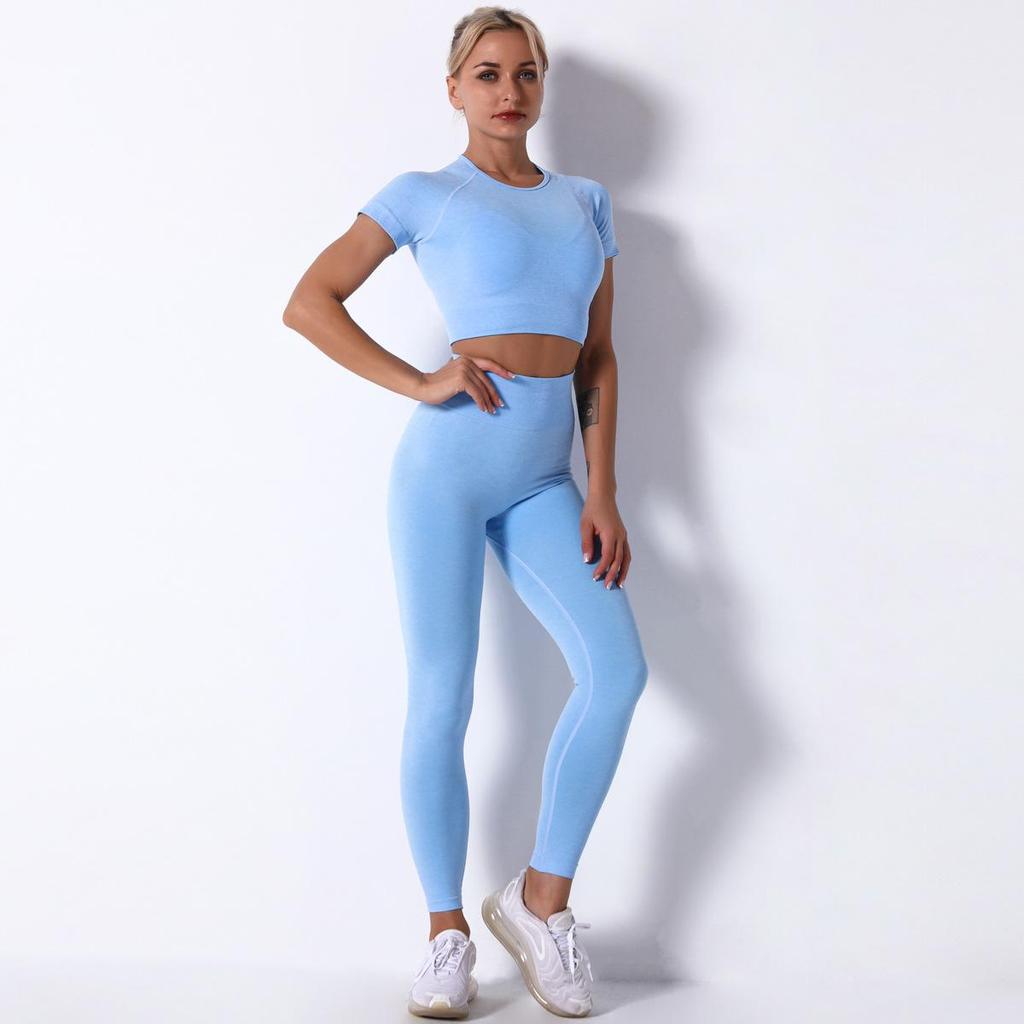 Женский комплект для фитнеса, йоги, бесшовный однотонный укороченный топ с короткими рукавами, леггинсы с высокой талией, спортивная одежда, женский комплект из 2 предметов, одежда для спортзала
