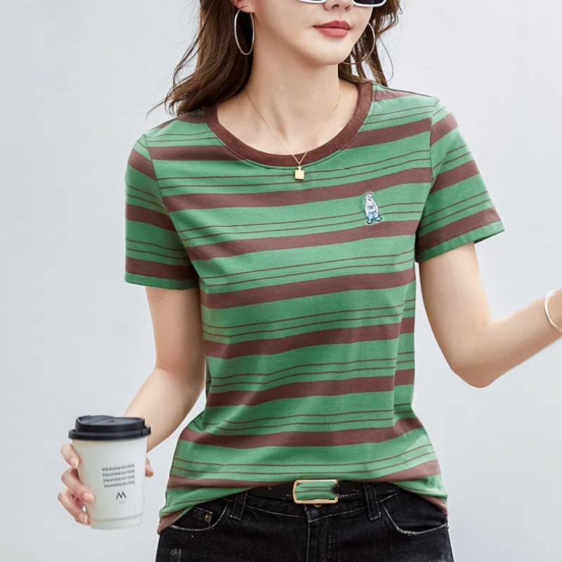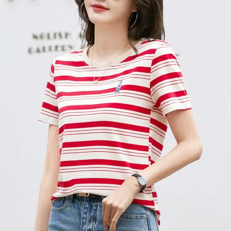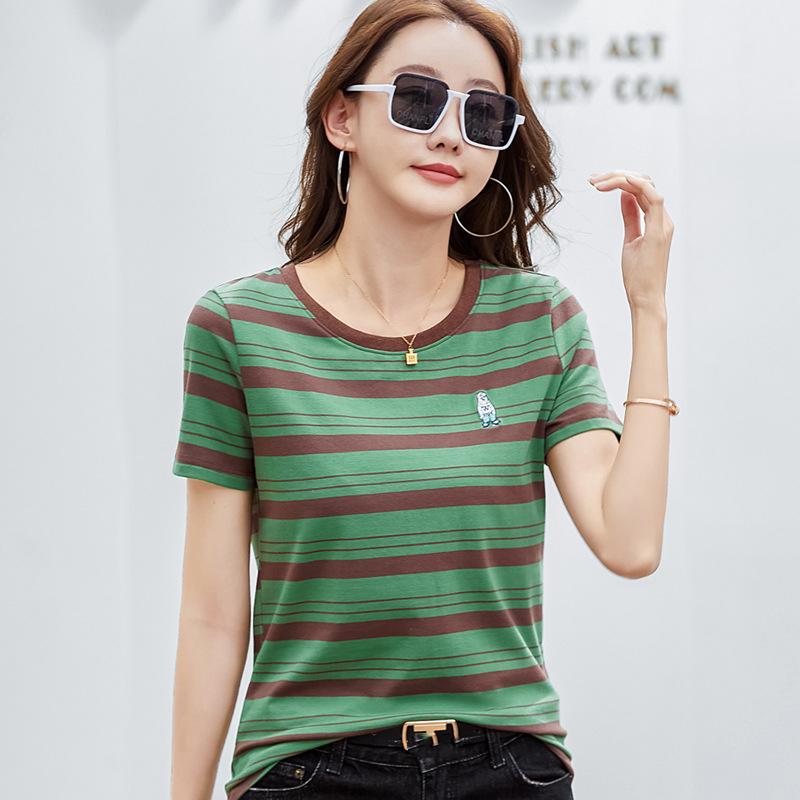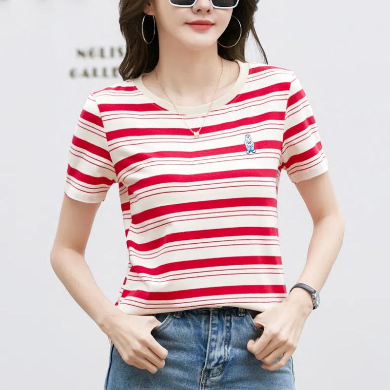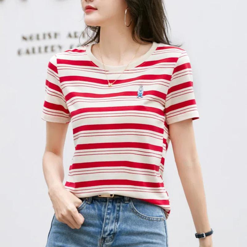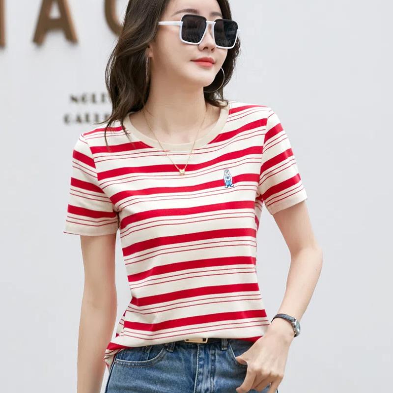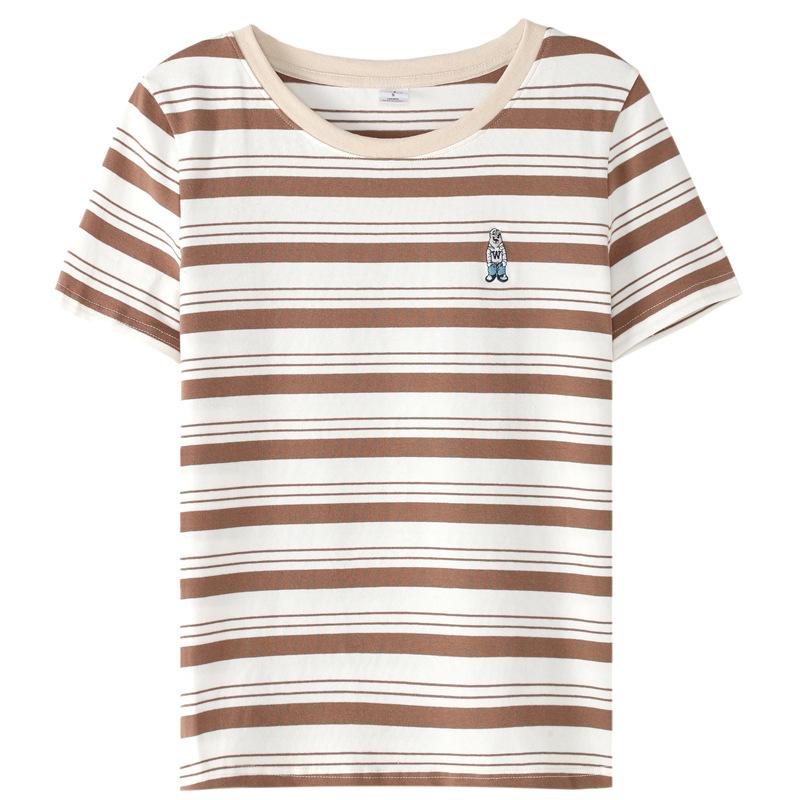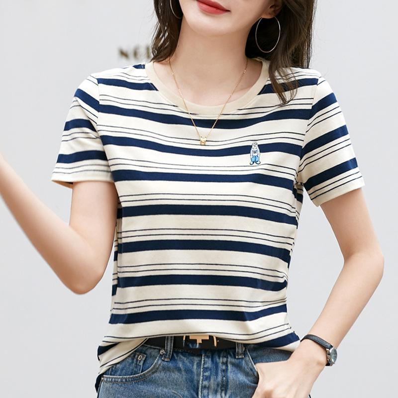 Корейская полосатая хлопковая футболка с короткими рукавами женская летняя повседневная нишевая дизайнерская шикарная свободная футболка с вышитым медведем