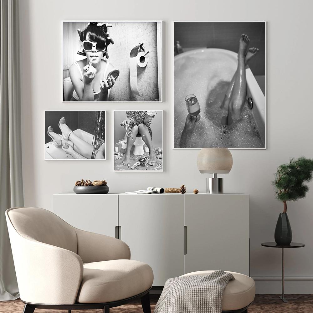 Современный туалет, сексуальная женщина, принты на холсте, девушка в баре, пьющая ванная комната, постеры с изображением, модный черный, белый цвет, картина с изображением шампанского, декор