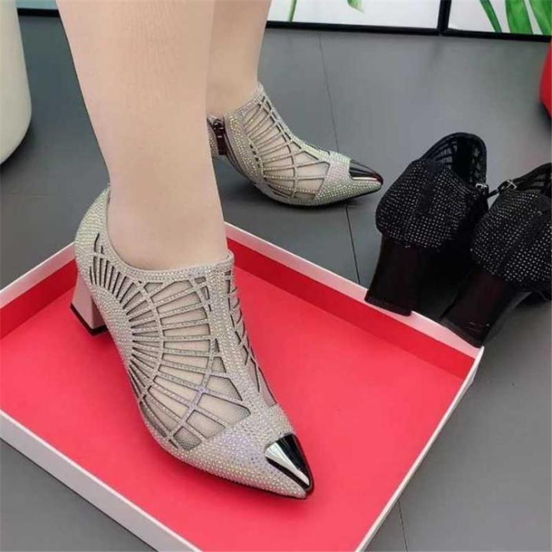 Осенние женские ботильоны, сексуальные туфли в сетку со стразами, модные летние туфли на каблуке, ботинки с острым носком