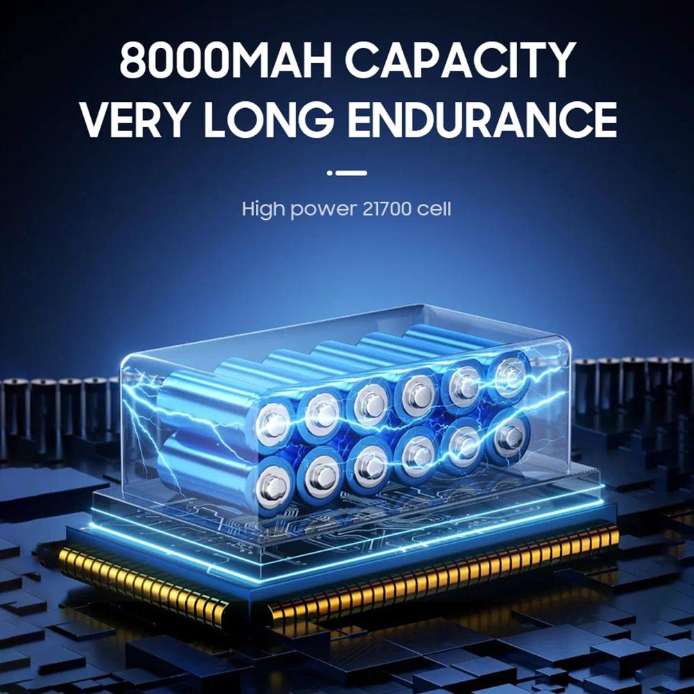 5. Быстрая зарядка:Оставайтесь на связи дольше благодаря нашим возможностям быстрой зарядки.. Автомобильный вентилятор поддерживает двухрежимную зарядку с возможностью быстрой зарядки типа C и постоянного тока, обеспечивая полную зарядку примерно за 1 час при входной мощности 90 Вт.. После полной зарядки он обеспечивает до 15 минут работы при максимальной скорости ветра, гарантируя, что вы сможете выполнять задачи без перерыва..