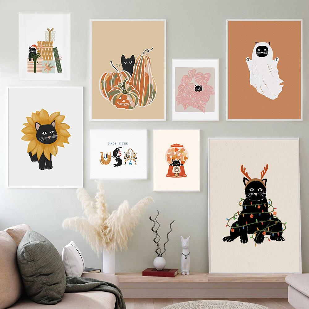 Мультфильм Черный Кот Призрак Тыквы Настенная Картина на Холсте Плакаты на скандинавскую тему и принты Хэллоуин Рождественские фотографии Декор детской комнаты