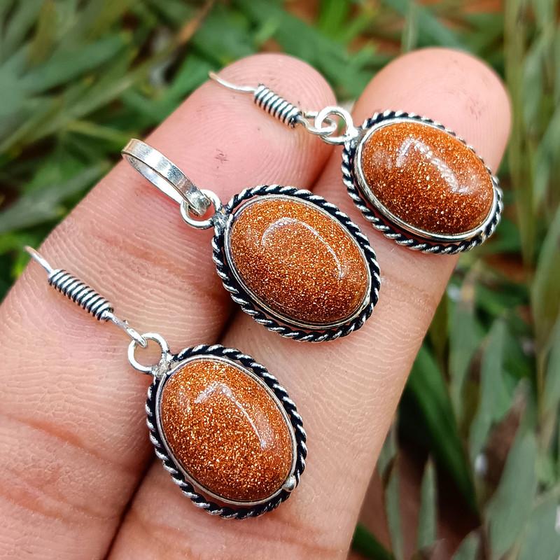 Gift Sunstone Gemstone 925 Sterling Silver Plated Unisex Earring & Pendant Set OM-31