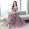 Женские весенние и летние платья с тонкой талией, длинные платья с короткими рукавами и v-образным вырезом с принтом