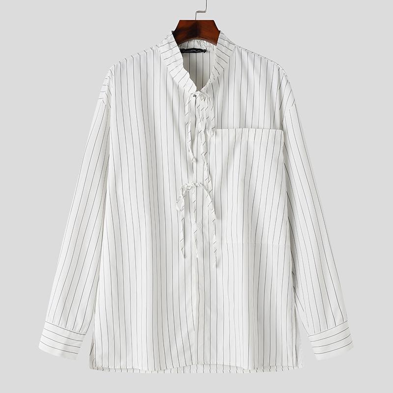 INCERUN Осенние мужские рубашки в полоску с длинным рукавом и воротником-стойкой, топы с повязками Bagge — купить товар онлайн с бесплатной доставкой до всему миру!