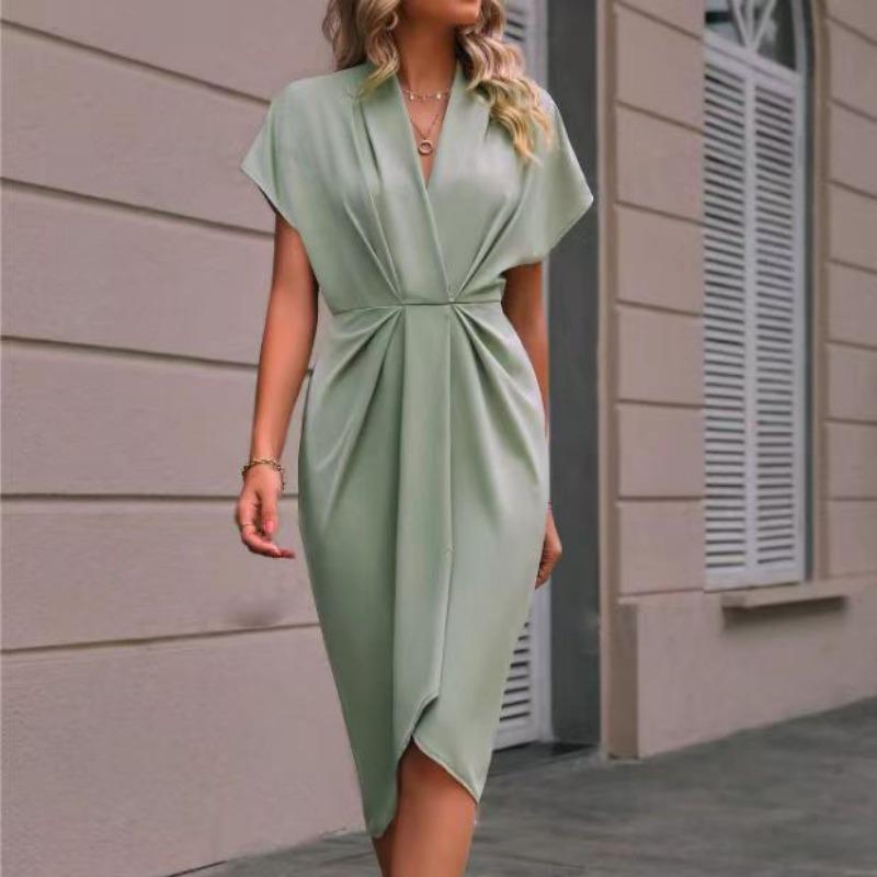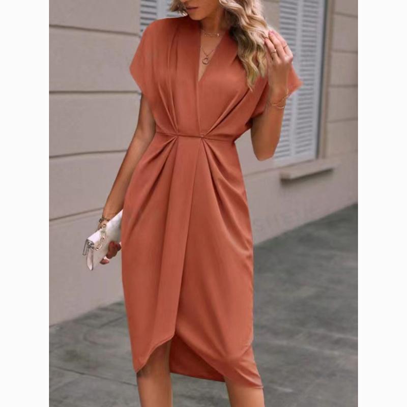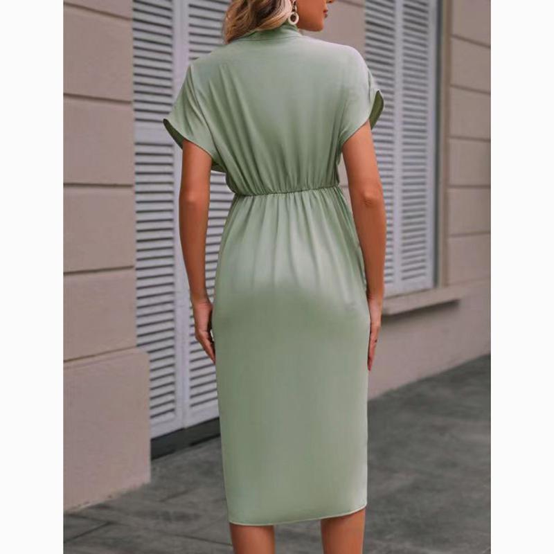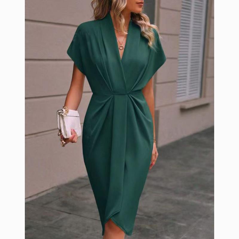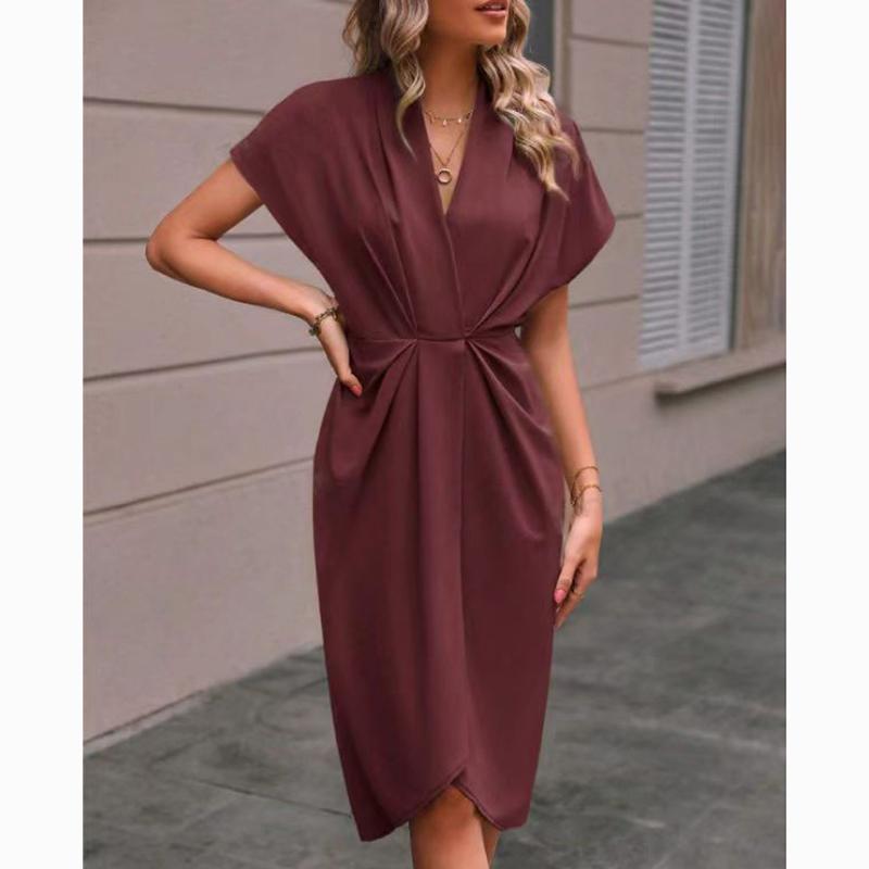 Весенне-летняя мода, однотонное элегантное платье, женское повседневное платье с коротким рукавом и высокой талией, женское повседневное платье с v-образным вырезом, офисные женские тонкие женские платья 24501