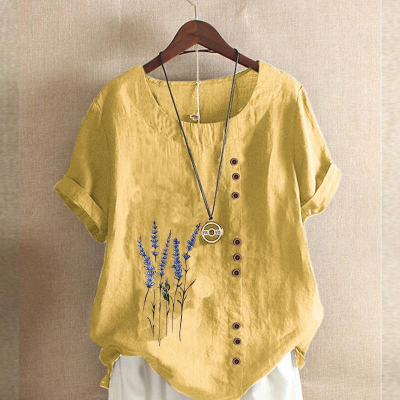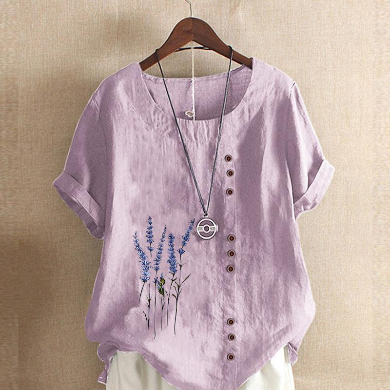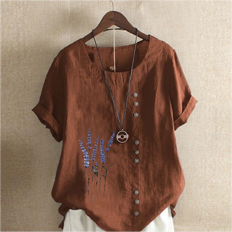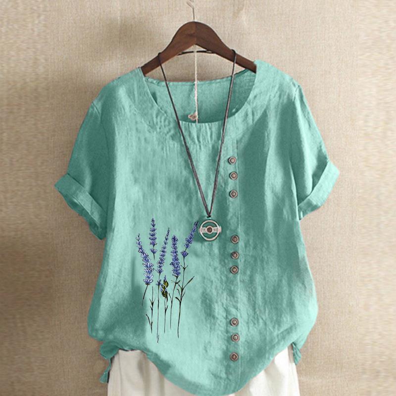Женская мода фиолетовые цветы напечатаны круглый вырез короткий рукав футболка повседневная хлопок лен графическая рубашка досуг свободные летние блузки топы