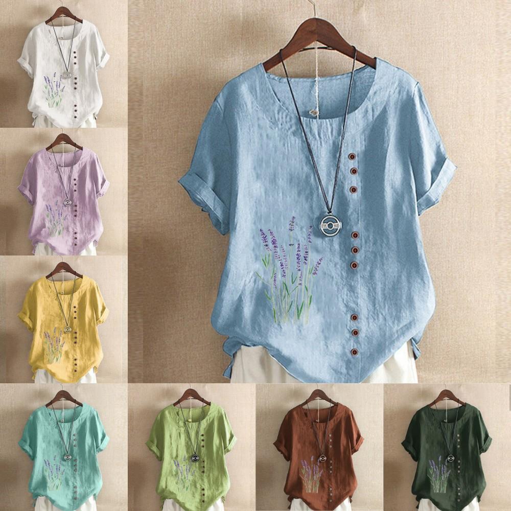 Женская модная футболка с круглым вырезом и коротким рукавом, повседневная хлопковая льняная рубашка с рисунком, свободная летняя блузка с фиолетовым цветочным принтом для отдыха, топы