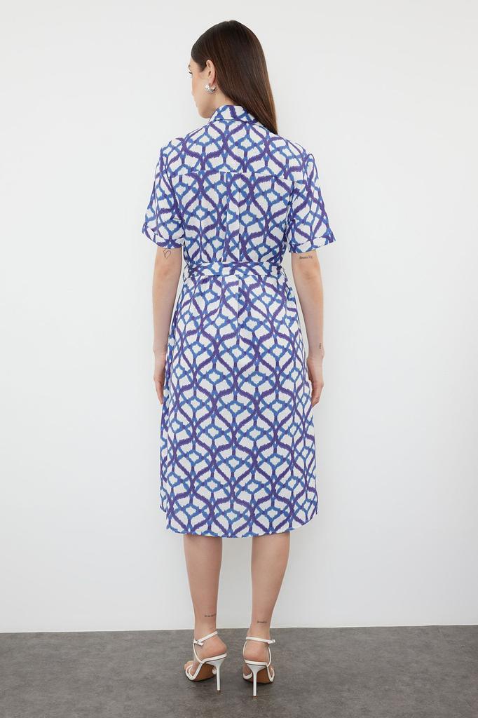 Женское стильное платье Синее тканое платье-рубашка миди с поясом