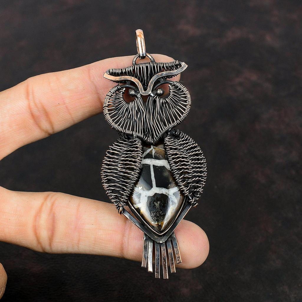 Подвеска из окаменелости в виде трещины в марокканской грязи, подвеска из медной проволоки, подвеска ручной работы из драгоценных камней, изумительное медное украшение, подвеска в виде совы, подарок на годовщину