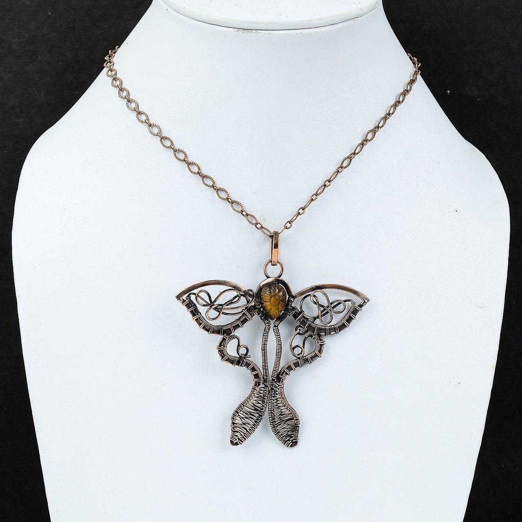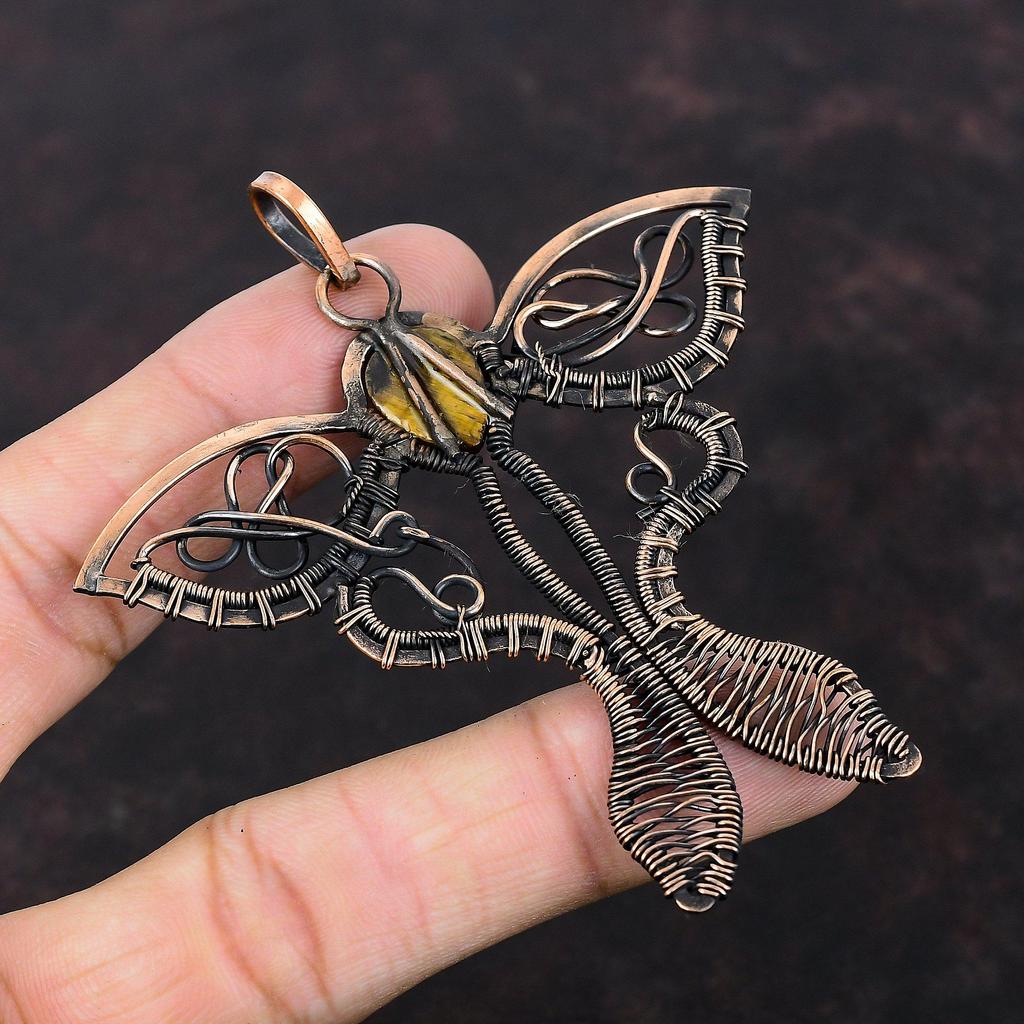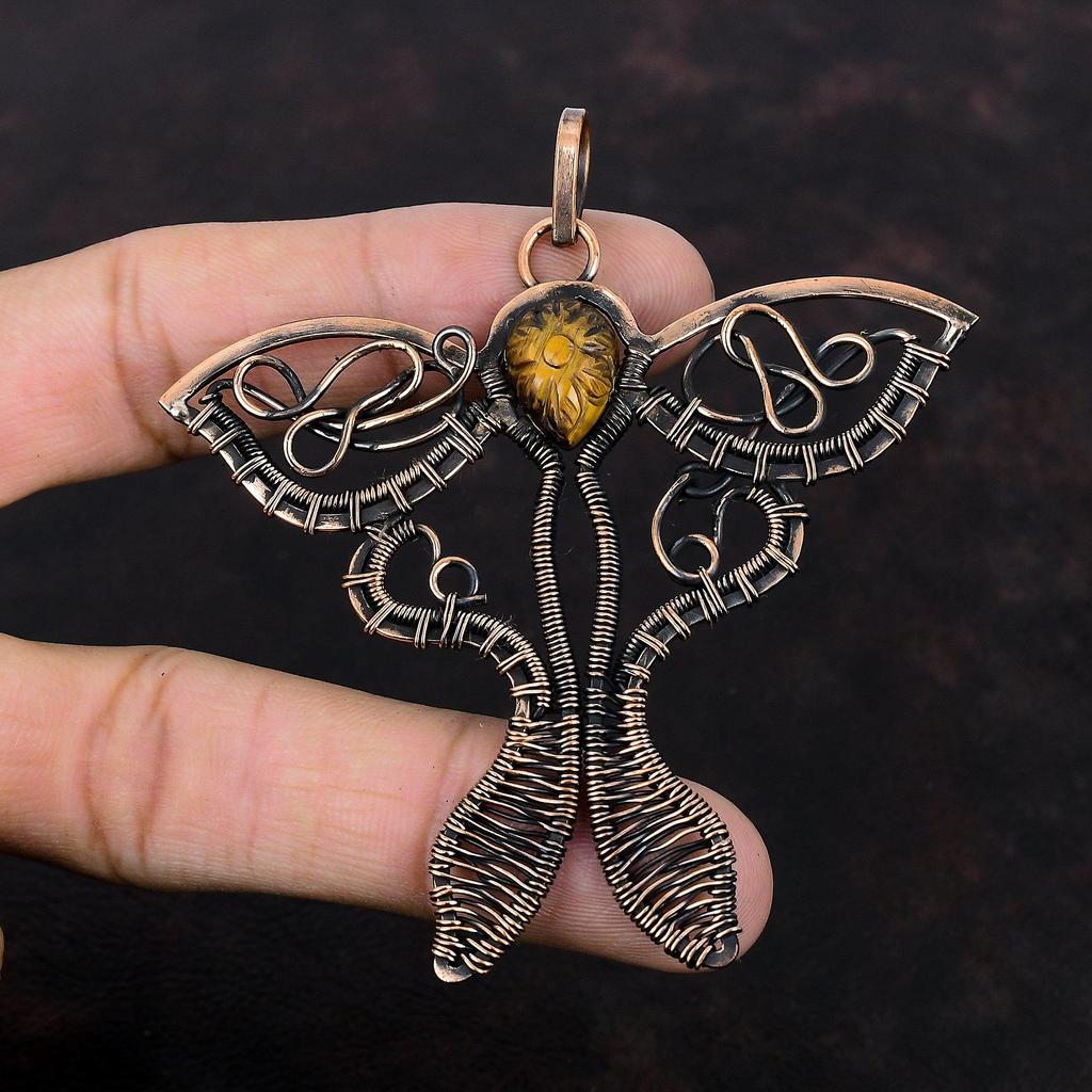 Резной кулон из тигрового глаза, обернутый медной проволокой, кулон в виде бабочки, драгоценный камень, медные украшения, кулон ручной работы, обернутый проволокой, украшения для подарка