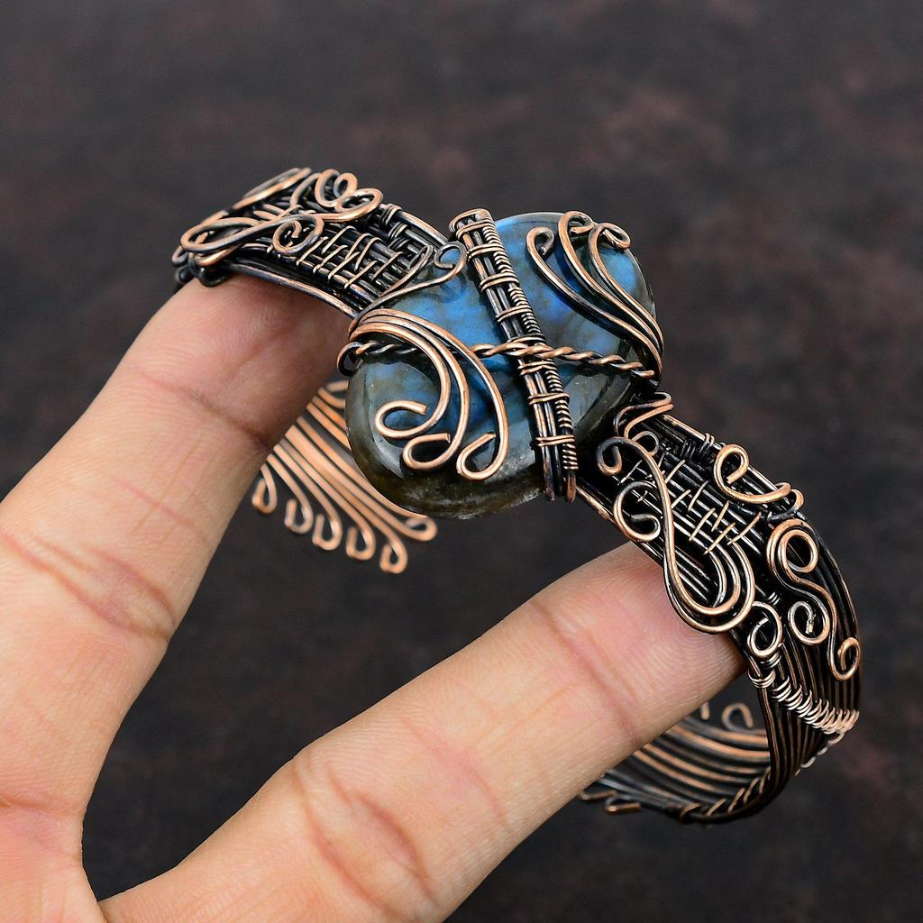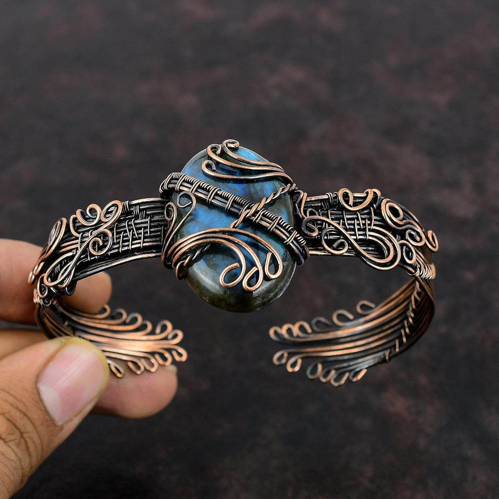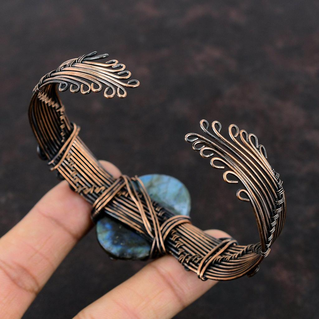 Браслет-манжета из лабрадорита, обмотанный медной проволокой, ювелирные изделия ручной работы из драгоценных камней, регулируемый браслет-манжета из лабрадорита, обмотанный медной проволокой, ювелирные изделия