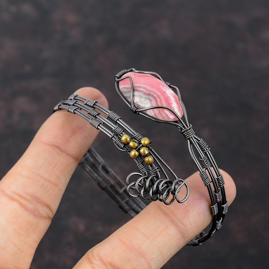 Браслет-манжета с родохрозитом, медная проволока, регулируемый браслет, антикварные ювелирные изделия ручной работы, браслет из настоящего драгоценного камня, ювелирные изделия из медной проволоки для подарка