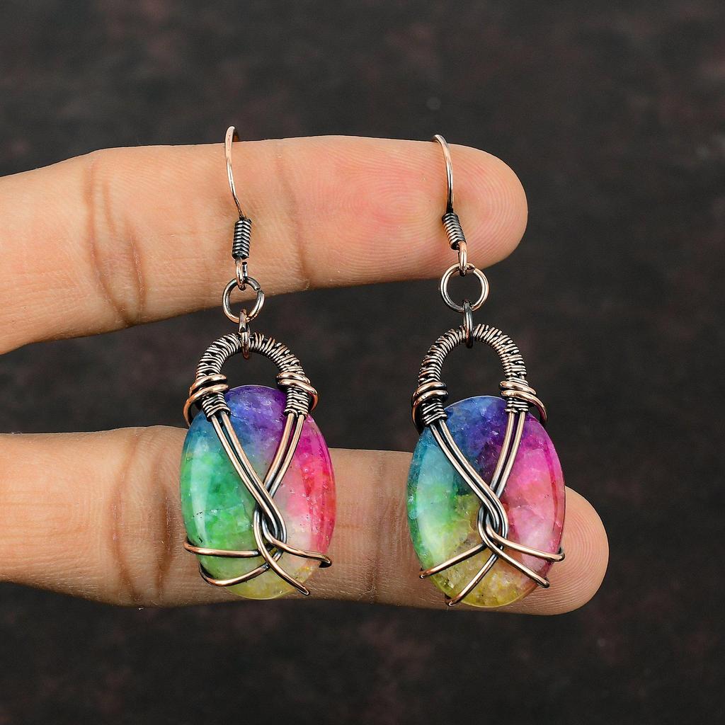 Радужные солнечные кварцевые серьги-друзы, серьги из медной проволоки, серьги ручной работы, ювелирные изделия из медной проволоки, серьги из натурального драгоценного камня, подарок для мамы