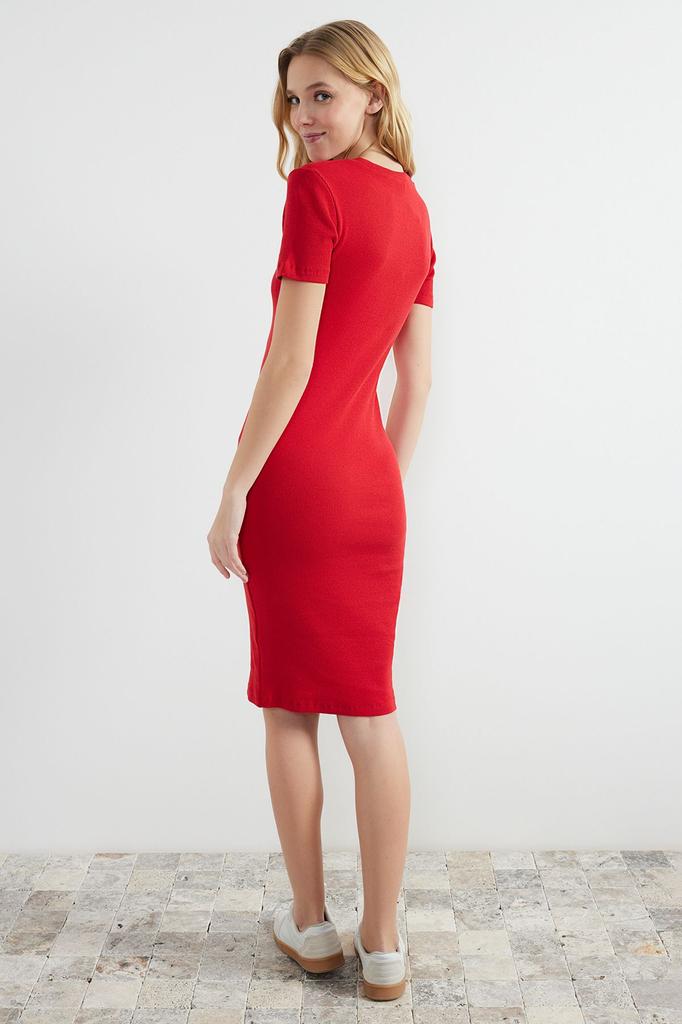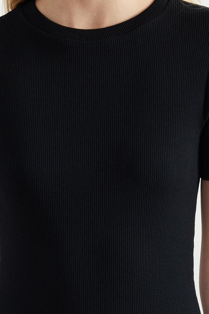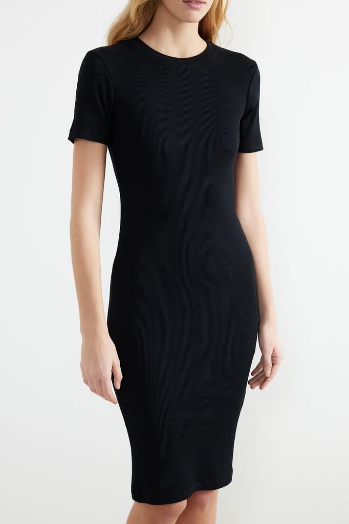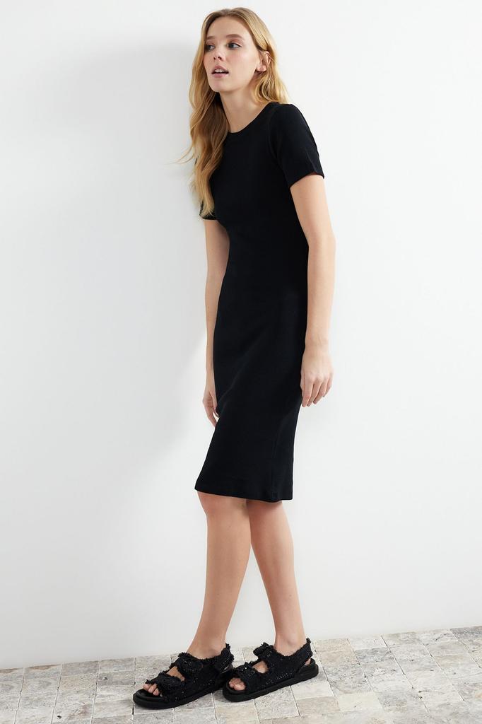 Женское стильное платье Черное эластичное трикотажное платье-карандаш в рубчик с круглым вырезом