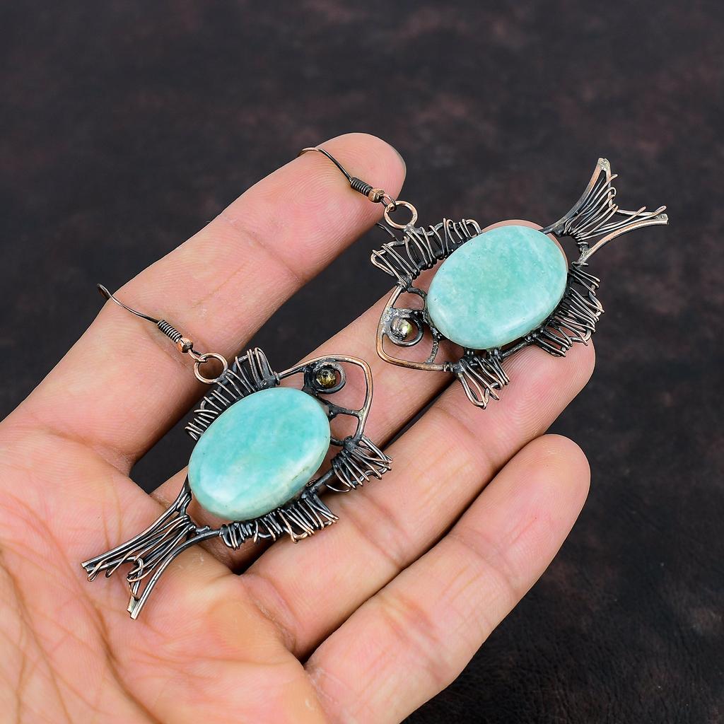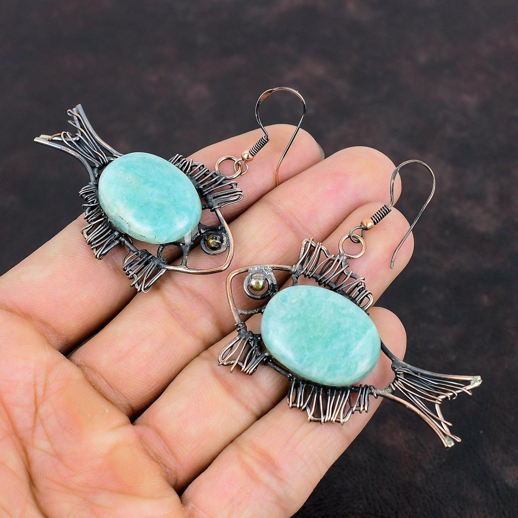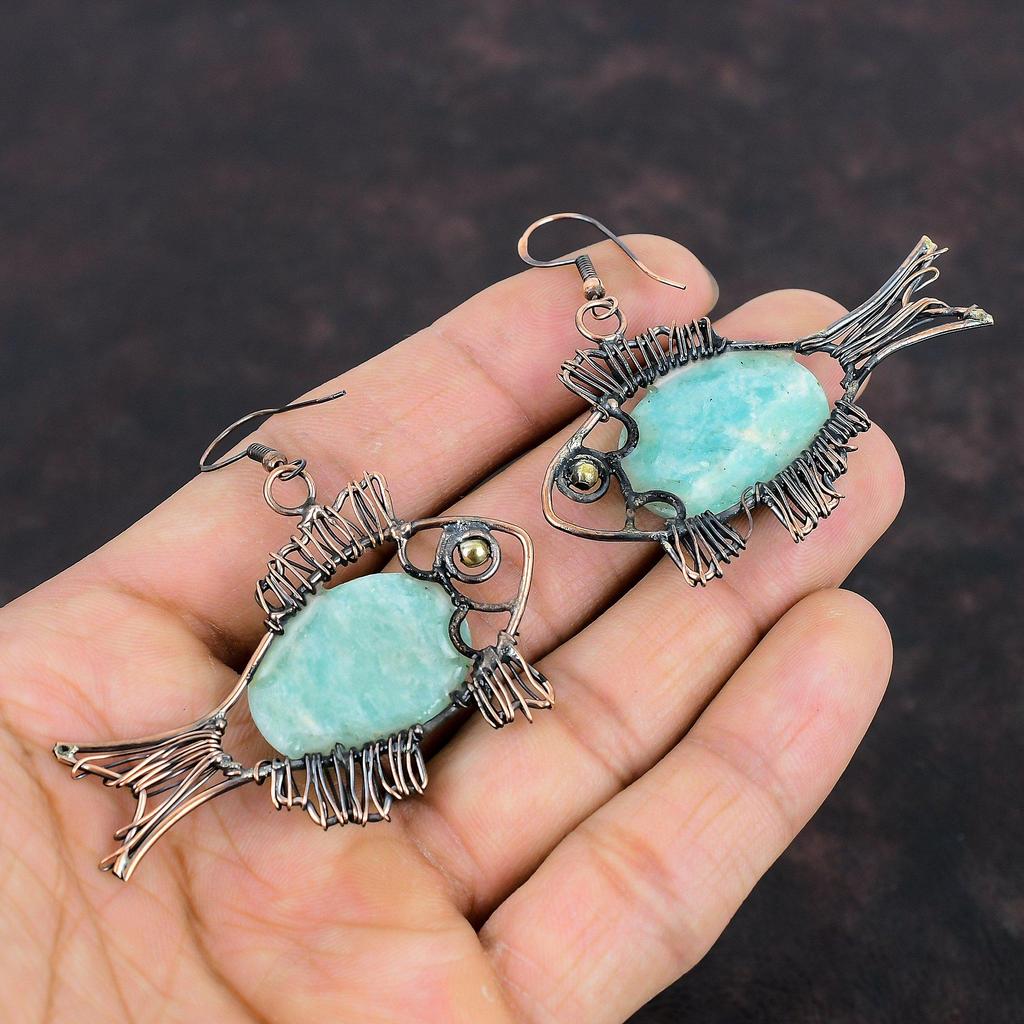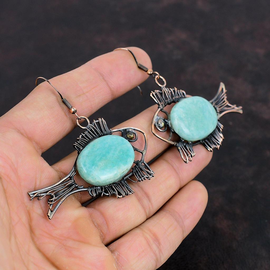 Серьги из амазонита, обернутые медной проволокой, серьги с драгоценными камнями, серьги-рыбки, медные украшения, подарки для матери, серьги ручной работы, украшения новейшего дизайна