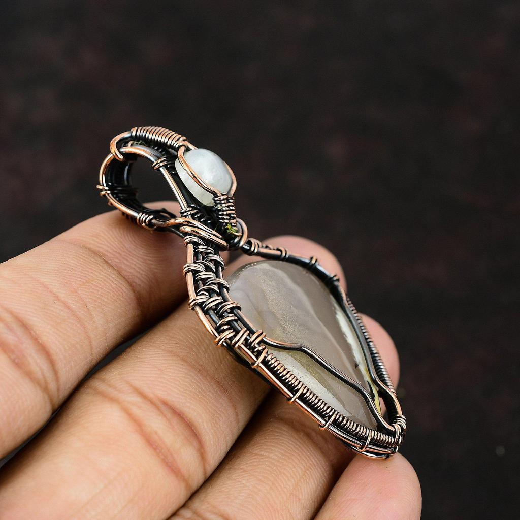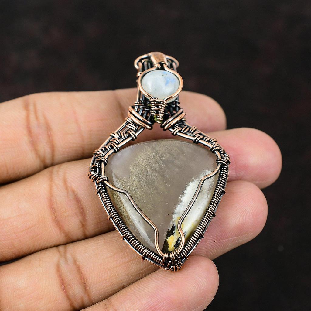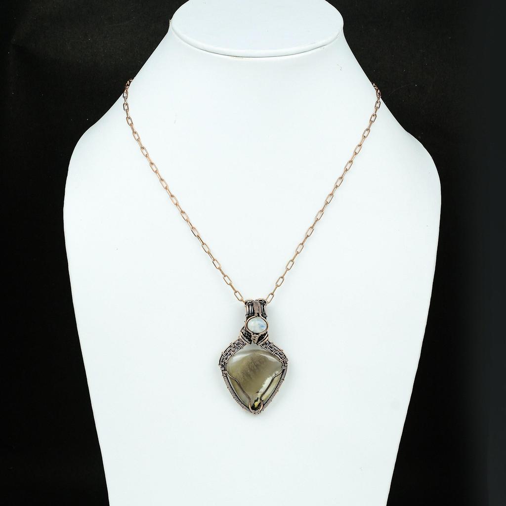 Подвеска из медной проволоки с перьями агата, лунный камень, медные украшения, подвеска из драгоценных камней ручной работы, дизайнерские украшения, подарок маме на день рождения