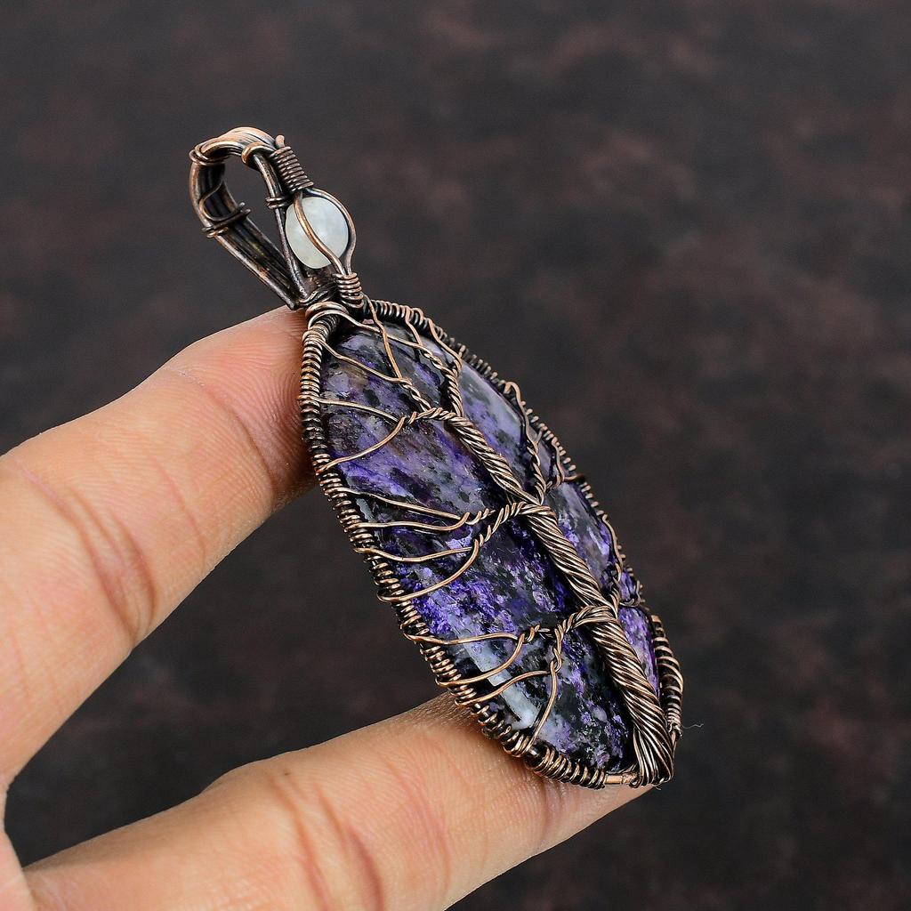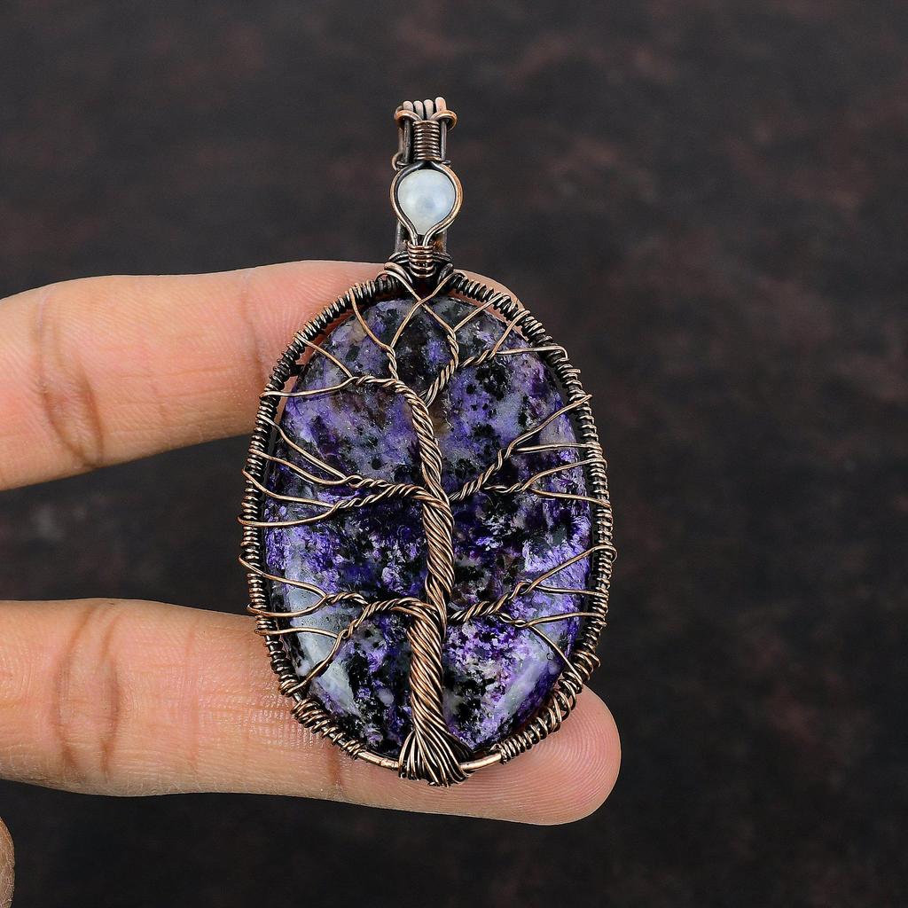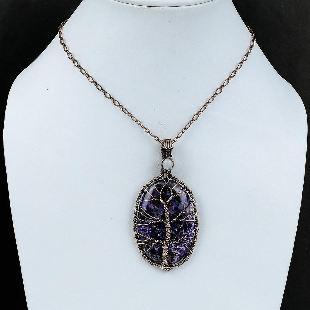 Подвеска из чароита «Дерево жизни», подвеска из медной проволоки, подвеска из драгоценного камня, подвеска из радужного лунного камня, ювелирное изделие ручной работы, подарок для нее