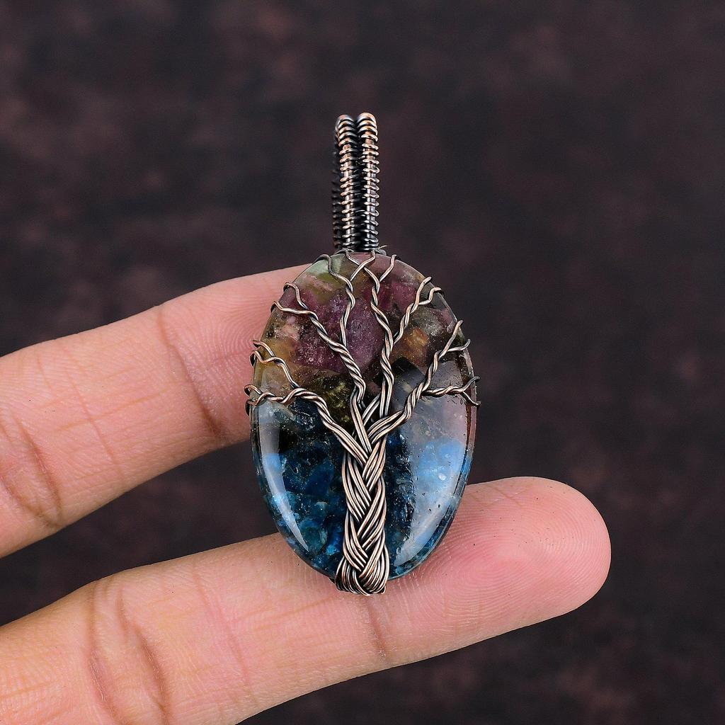 Кулон «Древо жизни» с арбузом и турмалином, кулон в проволочной обмотке, драгоценный камень, медный кулон, ювелирный подарок в проволочной обертке, подвески ручной работы для него