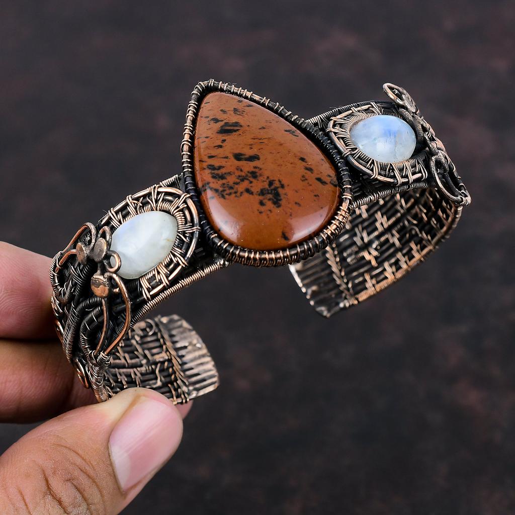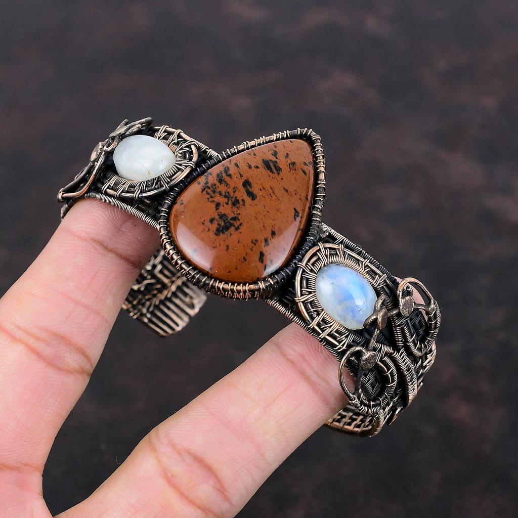 Браслет из красного дерева и обсидиана, браслет-манжета из медной проволоки, регулируемый браслет, ювелирные изделия ручной работы, браслет из радужного лунного камня, подарок для него