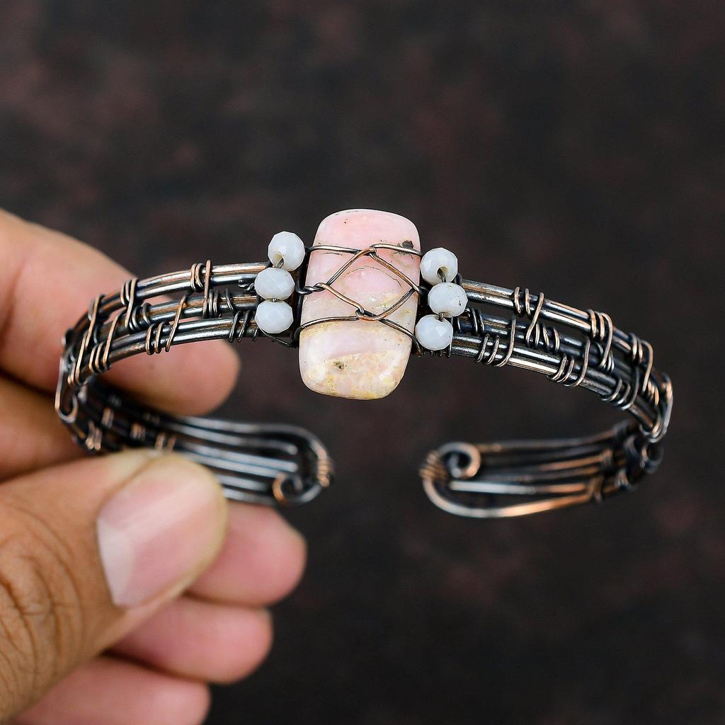 Браслет-манжета из розового опала и меди, браслет с синими кружевными бусинами из агата, браслет из медной проволоки, регулируемый браслет-манжета ручной работы