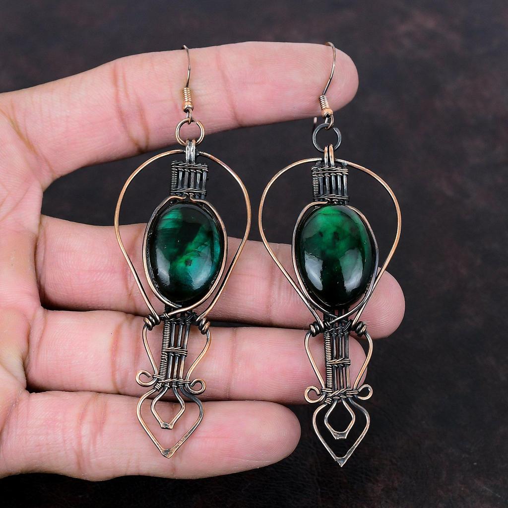 Серьги из зеленого огненного лабрадорита, серьги из медной проволоки, ювелирные изделия из лабрадорита и меди, изящные серьги из драгоценных камней, ювелирные изделия ручной работы, подарок для мамы