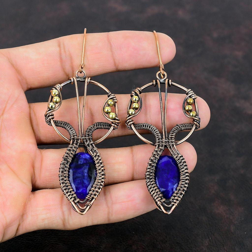 Серьги с граненым синим сапфиром, медная проволочная обертка, изящные серьги ручной работы, ювелирные изделия из меди с драгоценными камнями, дизайнерские серьги, подарок на годовщину