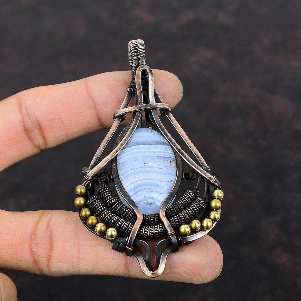 Кулон из голубого кружевного агата, кулон, обернутый медной проволокой, медные украшения, очень красивый кулон с драгоценным камнем, украшения из проволоки, кулон ручной работы для подарка