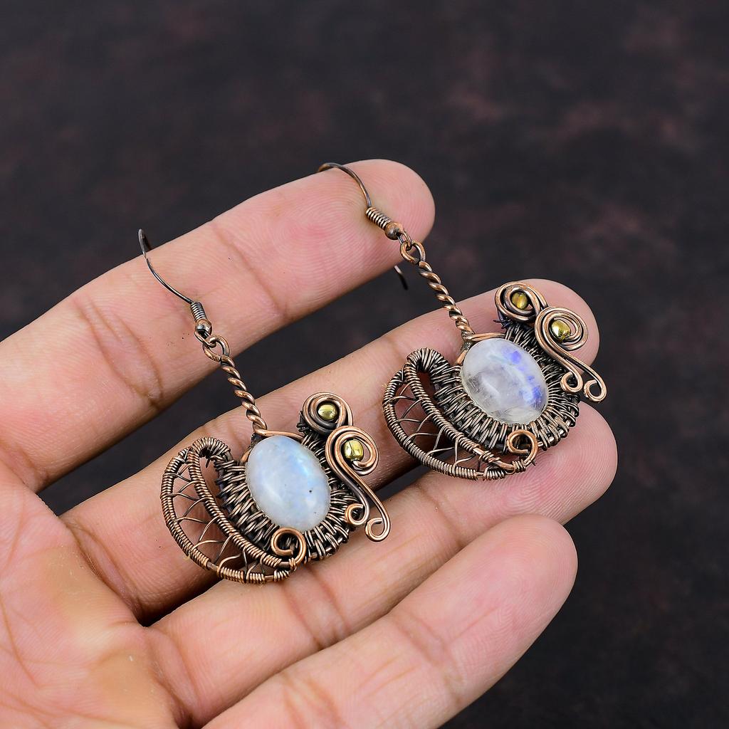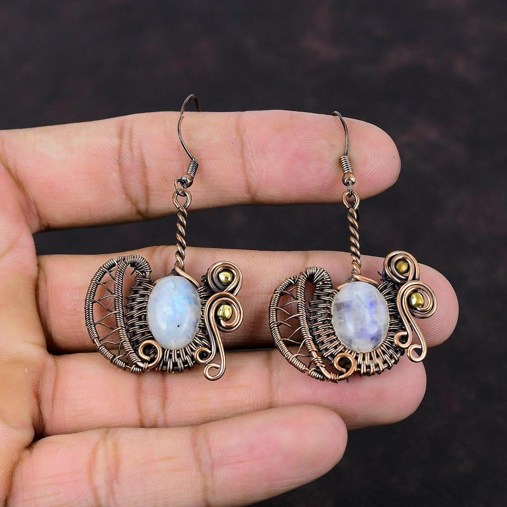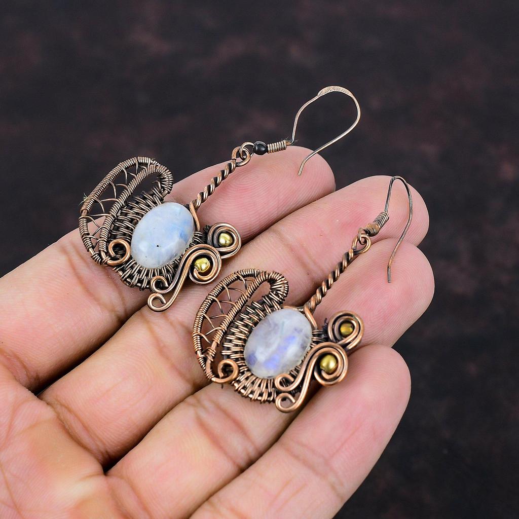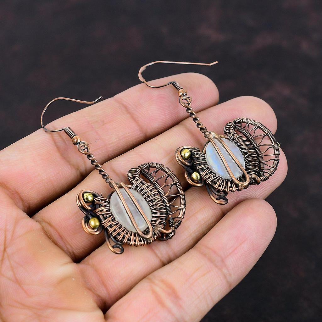 Серьги с радужным лунным камнем, серьги из медной проволоки, ювелирные изделия ручной работы, серьги с настоящими драгоценными камнями, медные ювелирные изделия, подарок для нее, серьги для женщин
