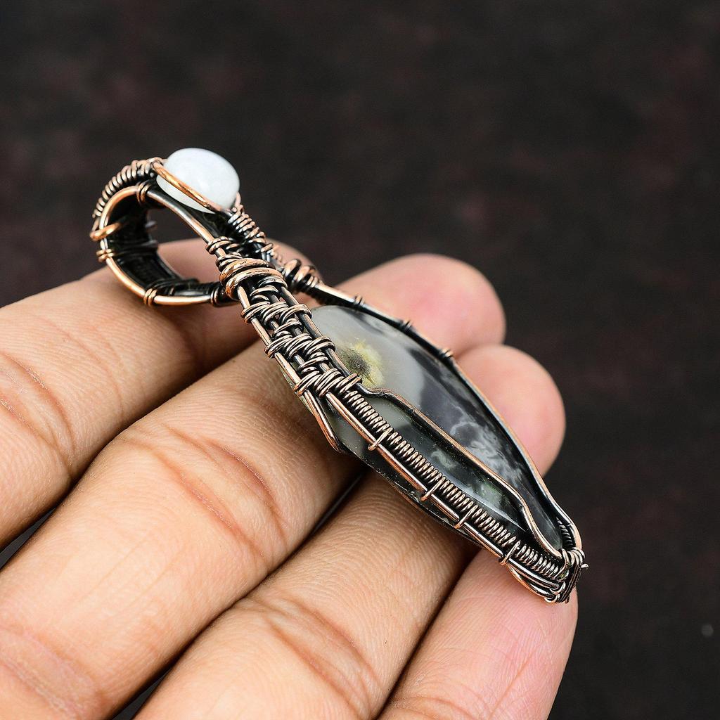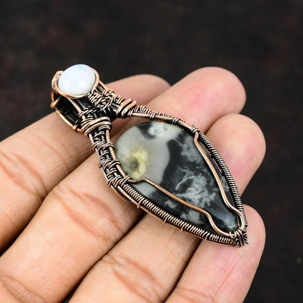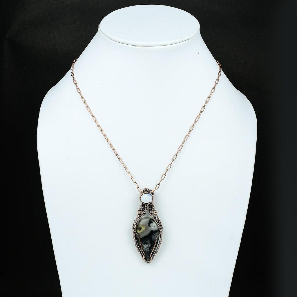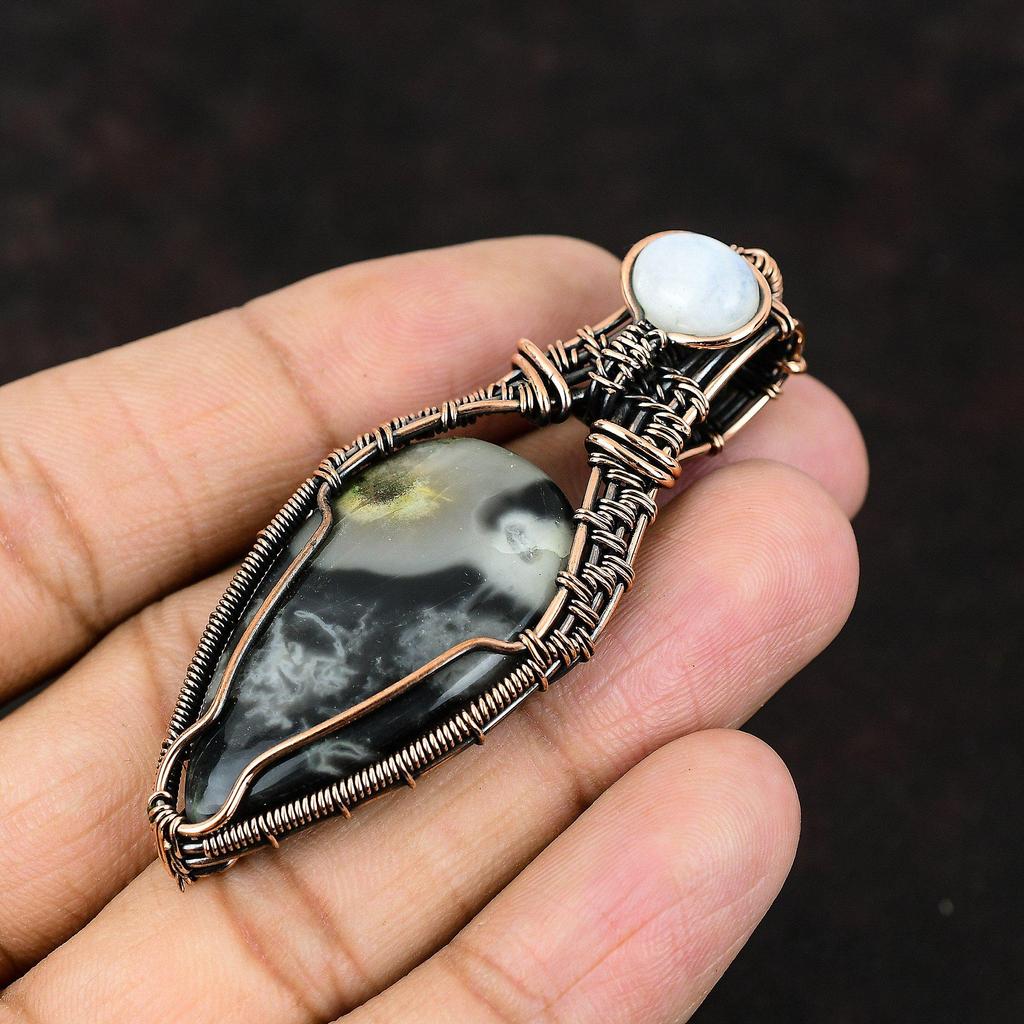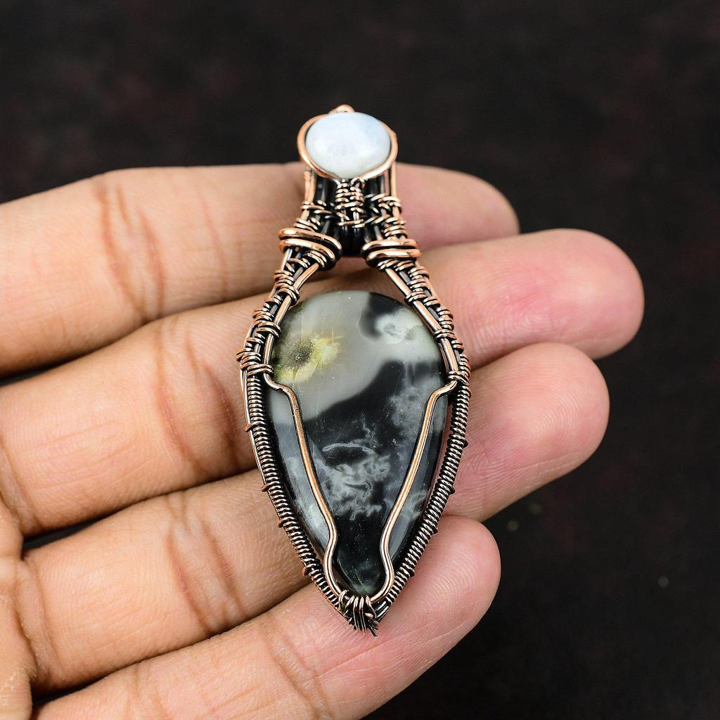 Кулон из яшмы Пикассо, обернутый медной проволокой, Драгоценный камень, Медный кулон, Кулон ручной работы, Украшения из радужного лунного камня, Подарок для мамы, Подарок для нее