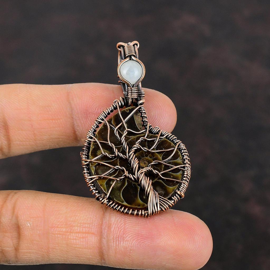 Древо жизни аммонитовый окаменелый кулон медная проволока обернутый кулон радужная лунная подвеска медные украшения кулон ручной работы из настоящего драгоценного камня