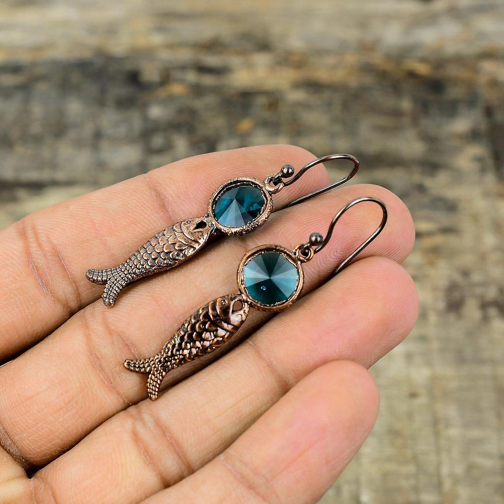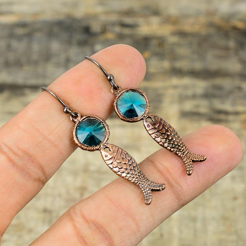 Серьги с индиколитом, гальванические медные серьги, гальванические ювелирные изделия, серьги с драгоценными камнями, медные украшения ручной работы, серьги-рыбы, подарок для женщин