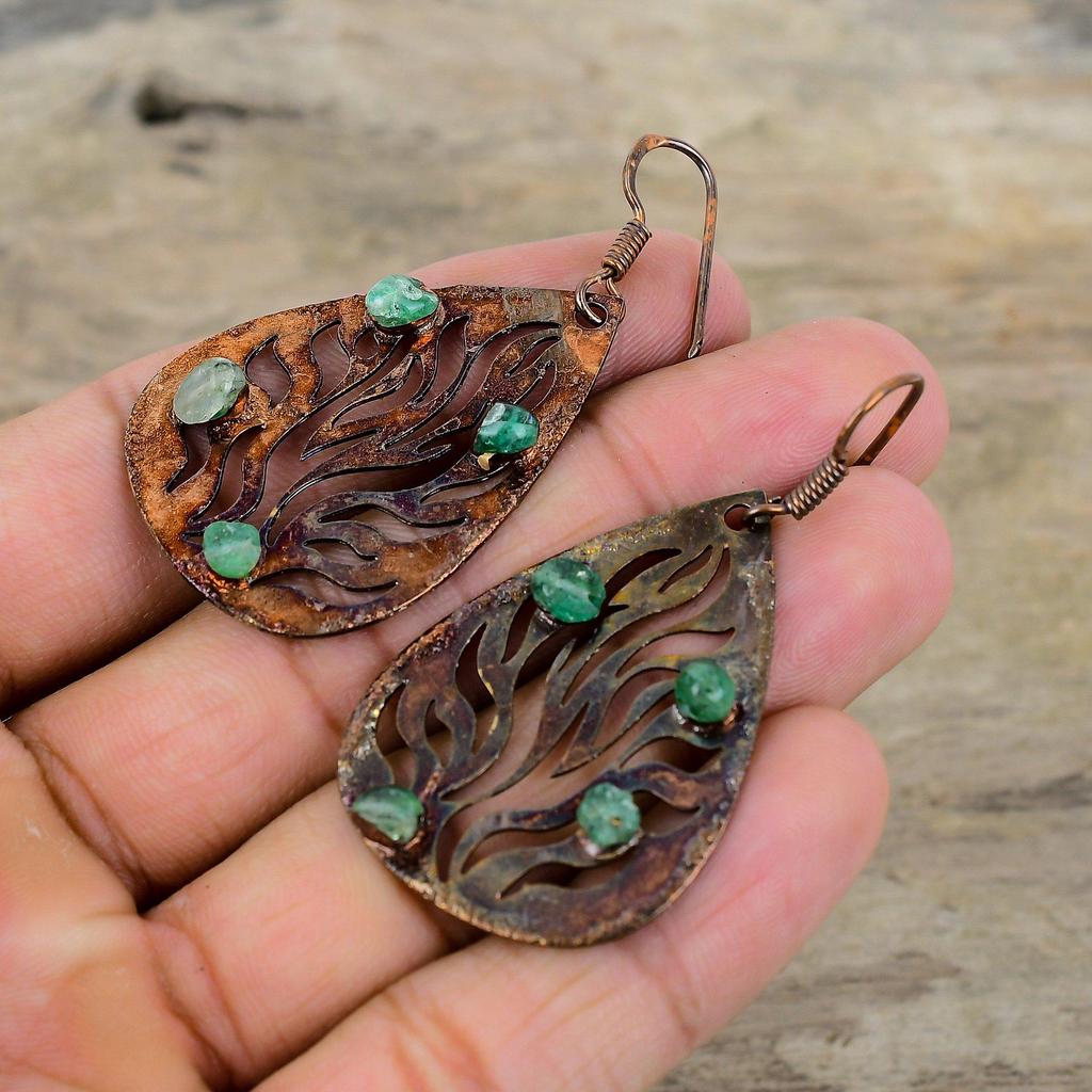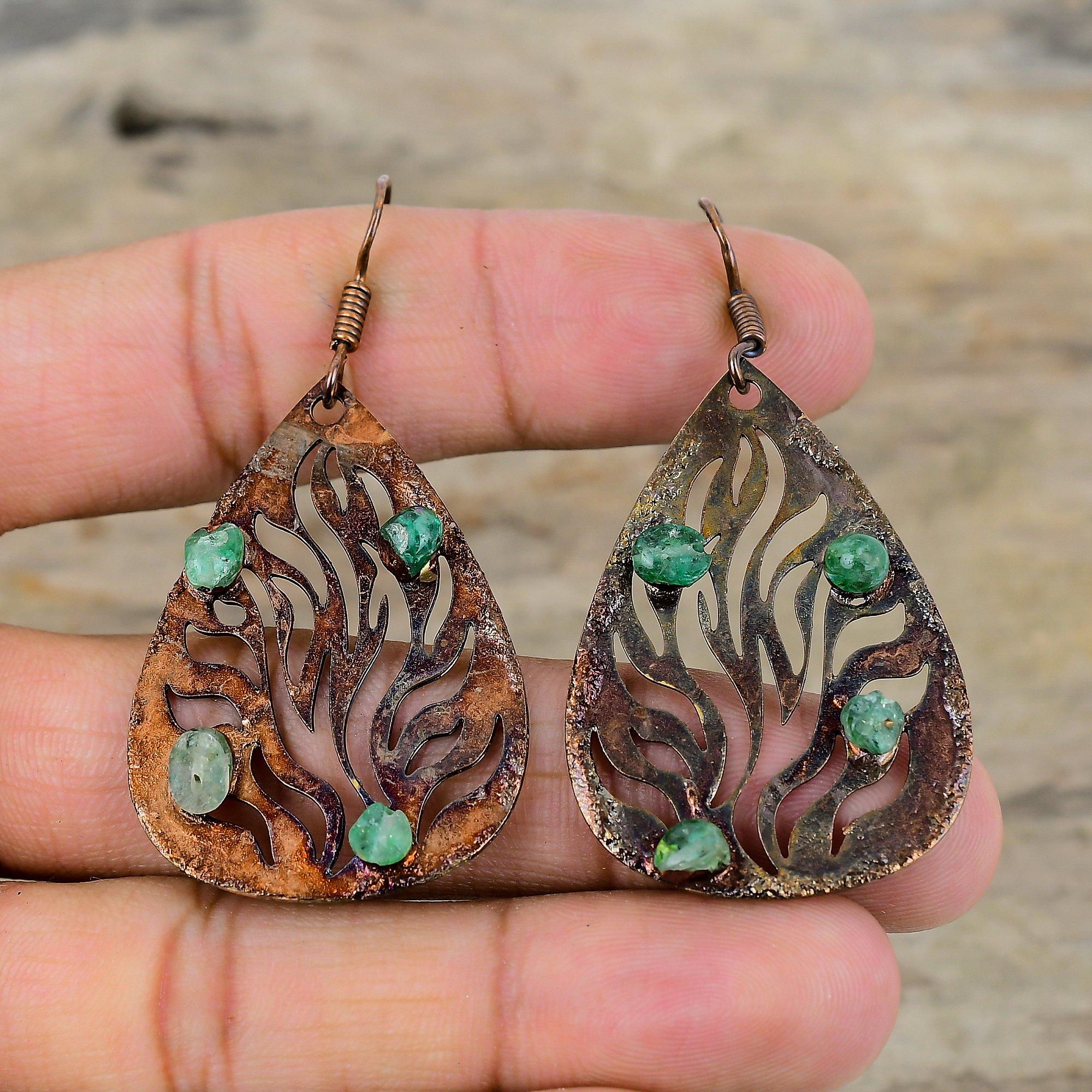 Серьги из необработанного драгоценного камня зеленого турмалина, гальванопластические медные серьги, ювелирные изделия ручной работы, достойные серьги для подарка, гальванопластические медные украшения