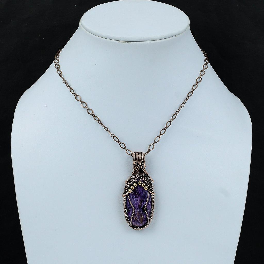 Подвеска из чароита, обернутая медной проволокой, антикварная бижутерия ручной работы, этническая подвеска, подарок для мамы, бижутерия из медной проволоки, подвеска из настоящего драгоценного камня