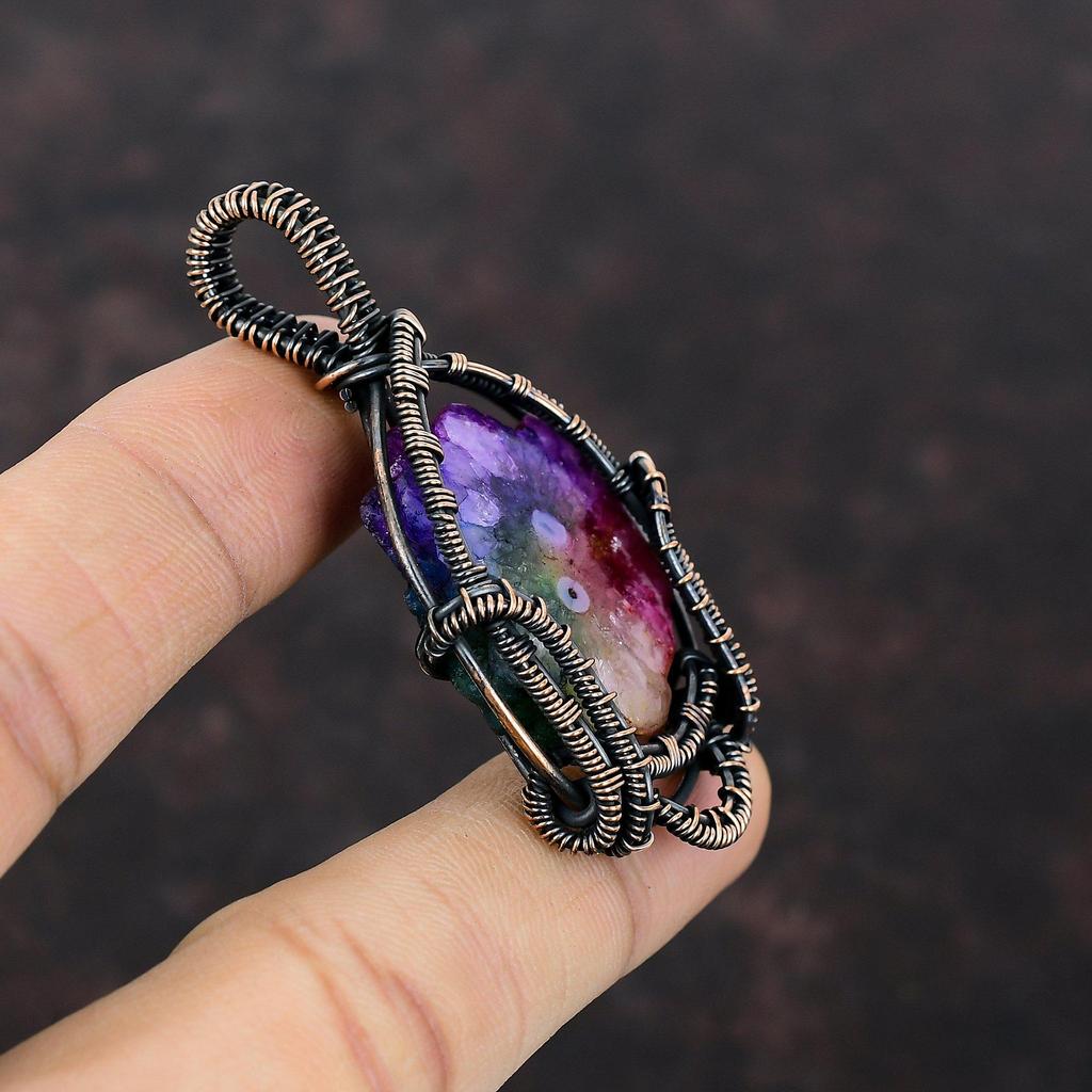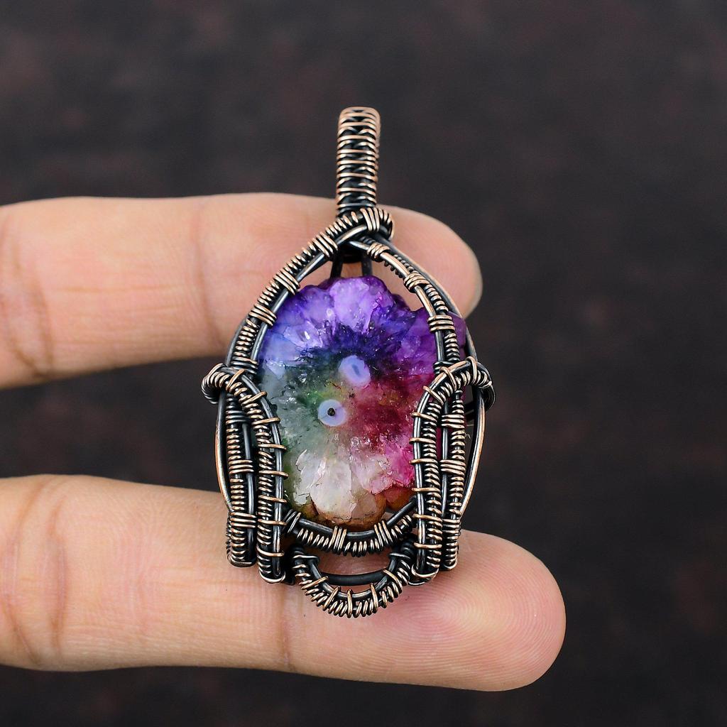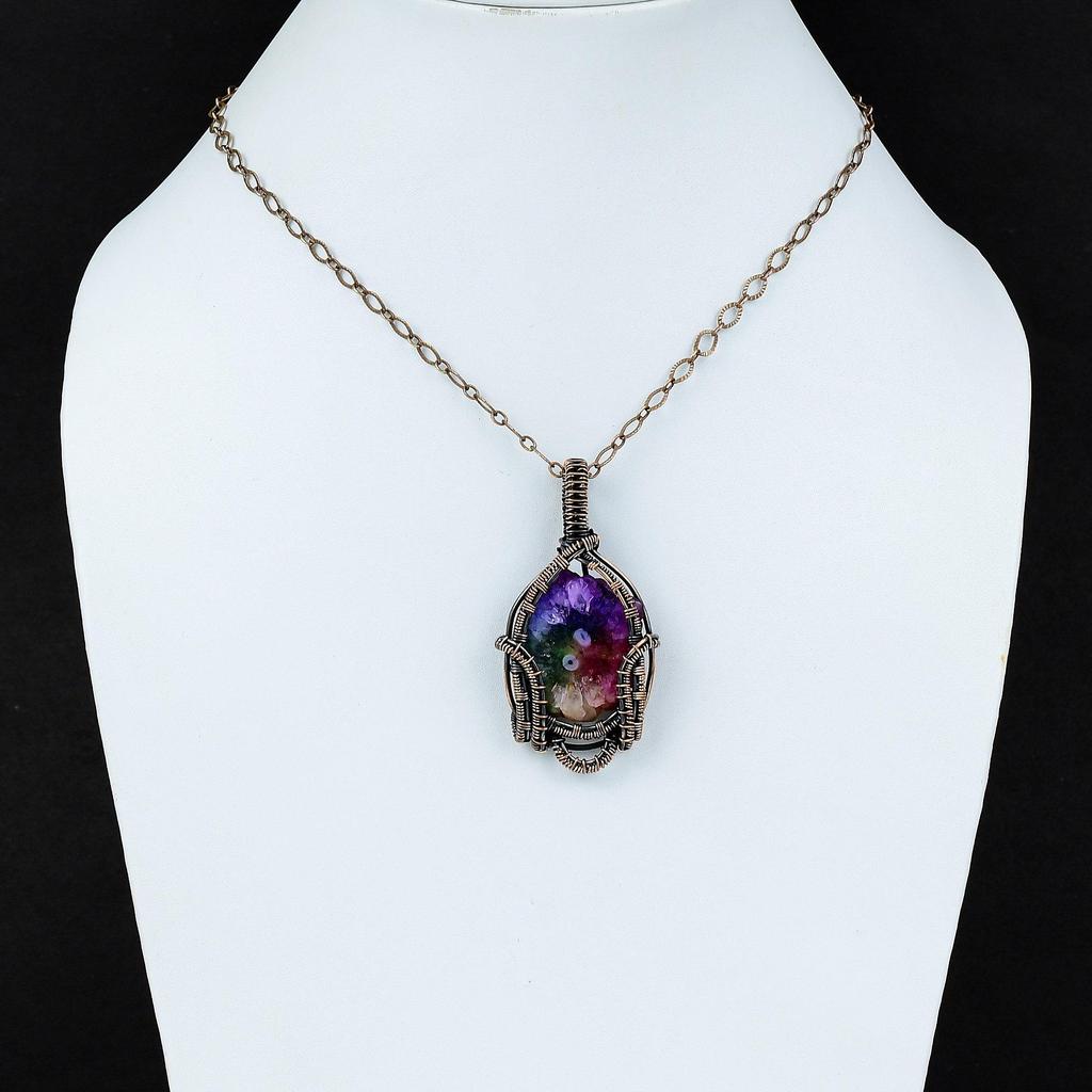 Подвеска Друза Радужный Солнечный Кварц Подвеска, Обмотанная Медной Проволокой, Ювелирные Изделия Ручной Работы, Подвеска из Драгоценного Камня Высшего Качества, Медные Ювелирные Изделия, Подарок на Свадьбу