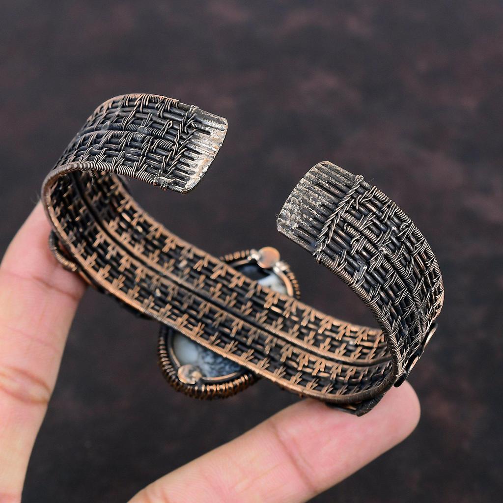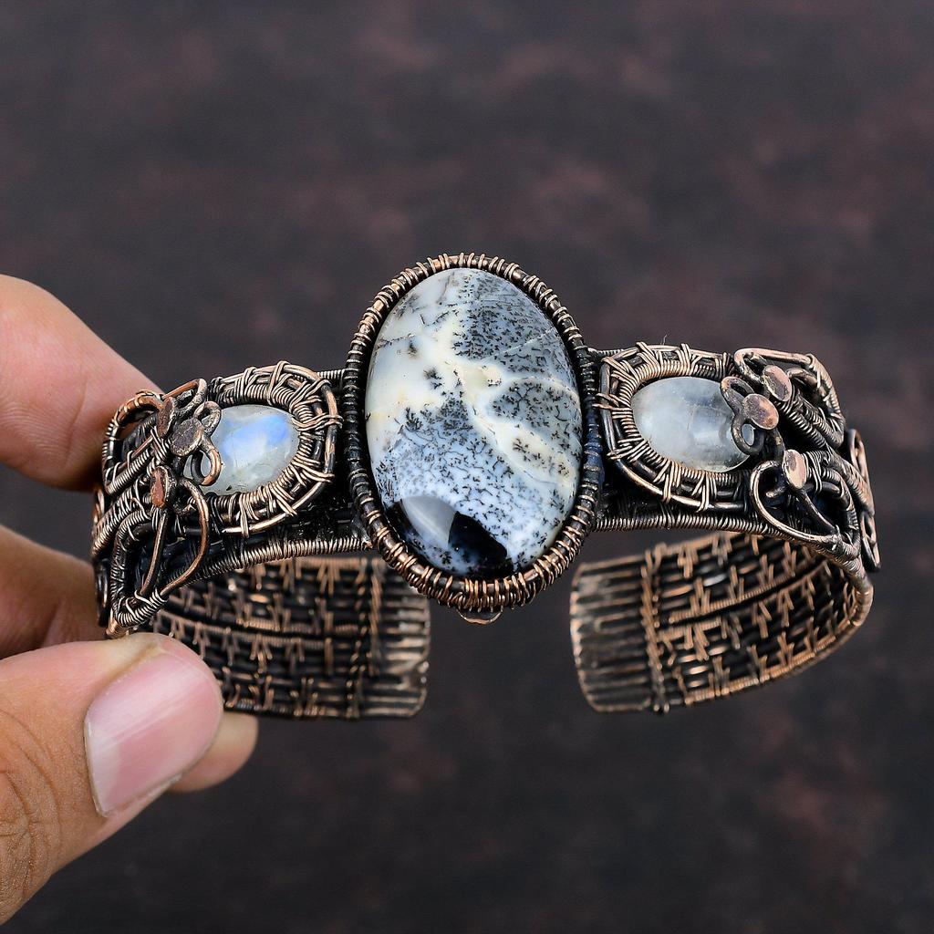 Браслет-манжета из дендритового опала, обмотанный медной проволокой, регулируемый браслет-бенгл, браслет-манжета с лунным камнем, медные украшения, браслет ручной работы для подарков