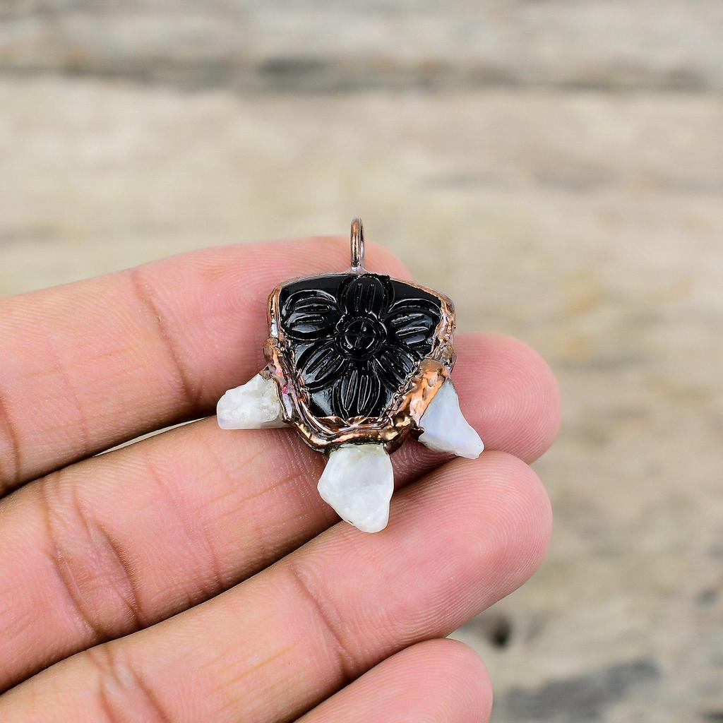 Резной черный оникс с радужным лунным камнем, грубый кулон, медный кулон, изготовленный гальваническим методом, драгоценный камень, ювелирные изделия, изготовленные гальваническим способом, кулон ручной работы для подарка