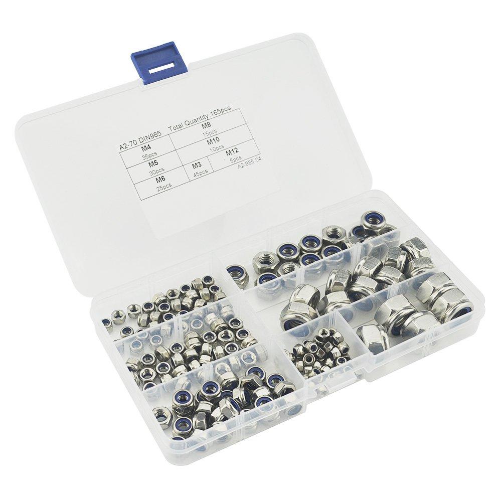 Набор нейлоновых стопорных гаек, 165 шт., шестигранные стопорные гайки из нержавеющей стали для болтов (орешки: М3 М4 М5 М6 М8 М10 М12)
