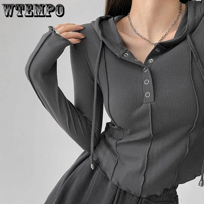 Тонкая толстовка с капюшоном Серый короткий топ с высокой талией Обнаженный пупок American Hottie Pure Desire Тонкая футболка со складками и длинными рукавами