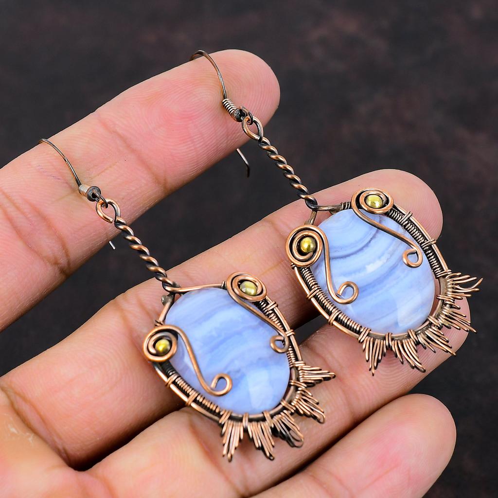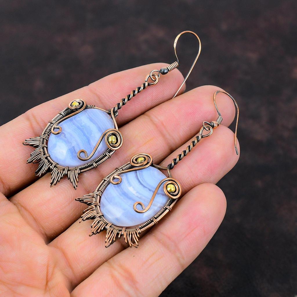 Серьги из голубого кружевного агата, серьги с медной проволокой, серьги с драгоценными камнями ручной работы, серьги-подвески из меди, ювелирные изделия с проволочной оберткой, подарок на помолвку