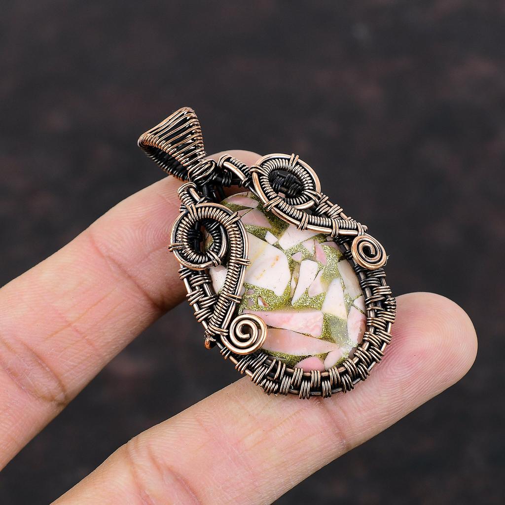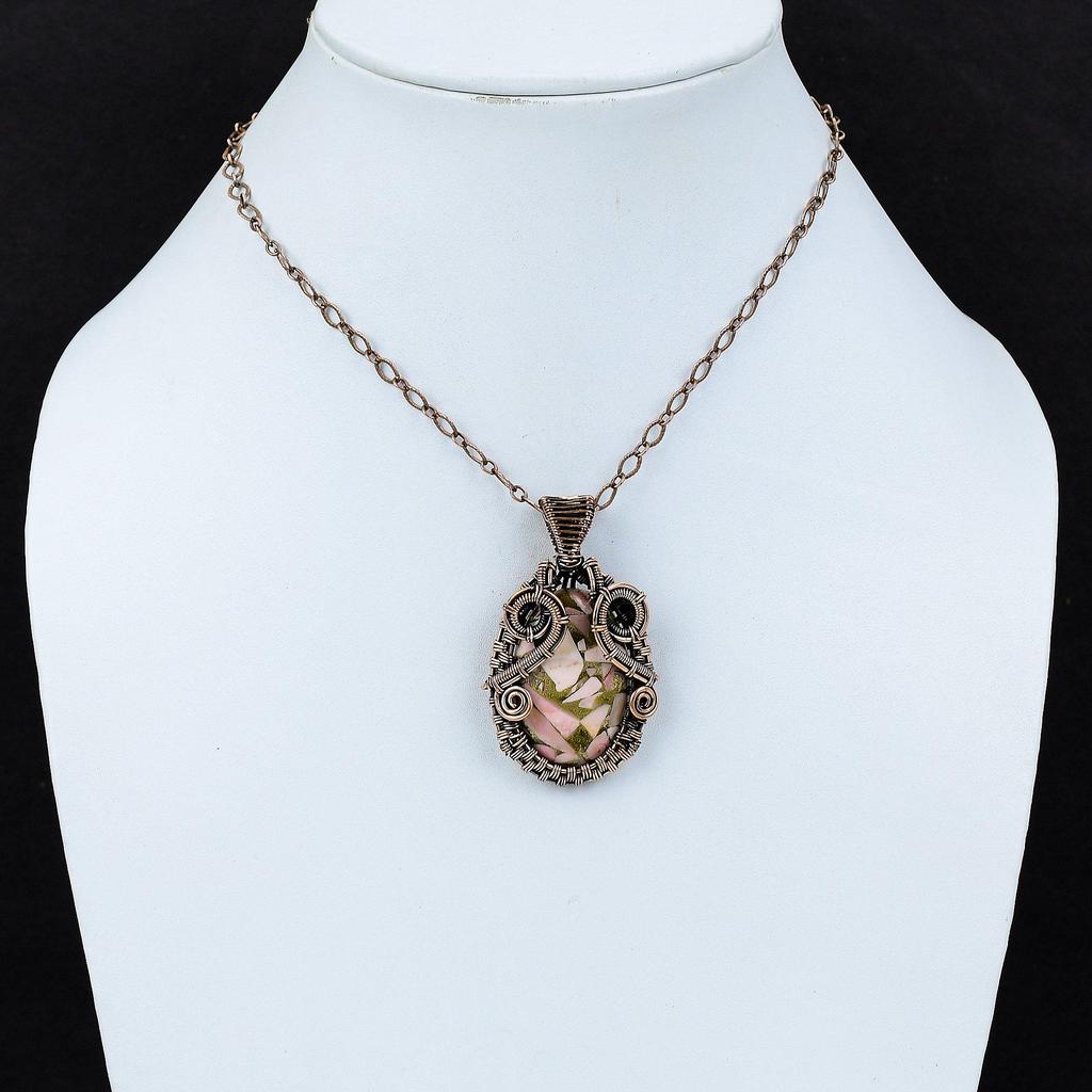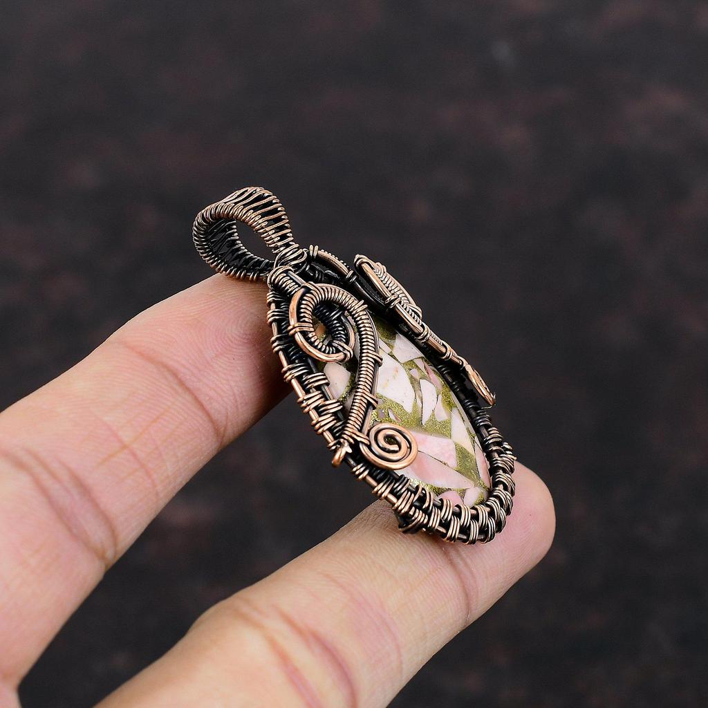 Медный кулон с розовым опалом Кулон, обернутый медной проволокой Ручной работы Уникальный кулон Розовый опал Драгоценный камень Ювелирное изделие Подарок на годовщину Ювелирные изделия из медной проволоки