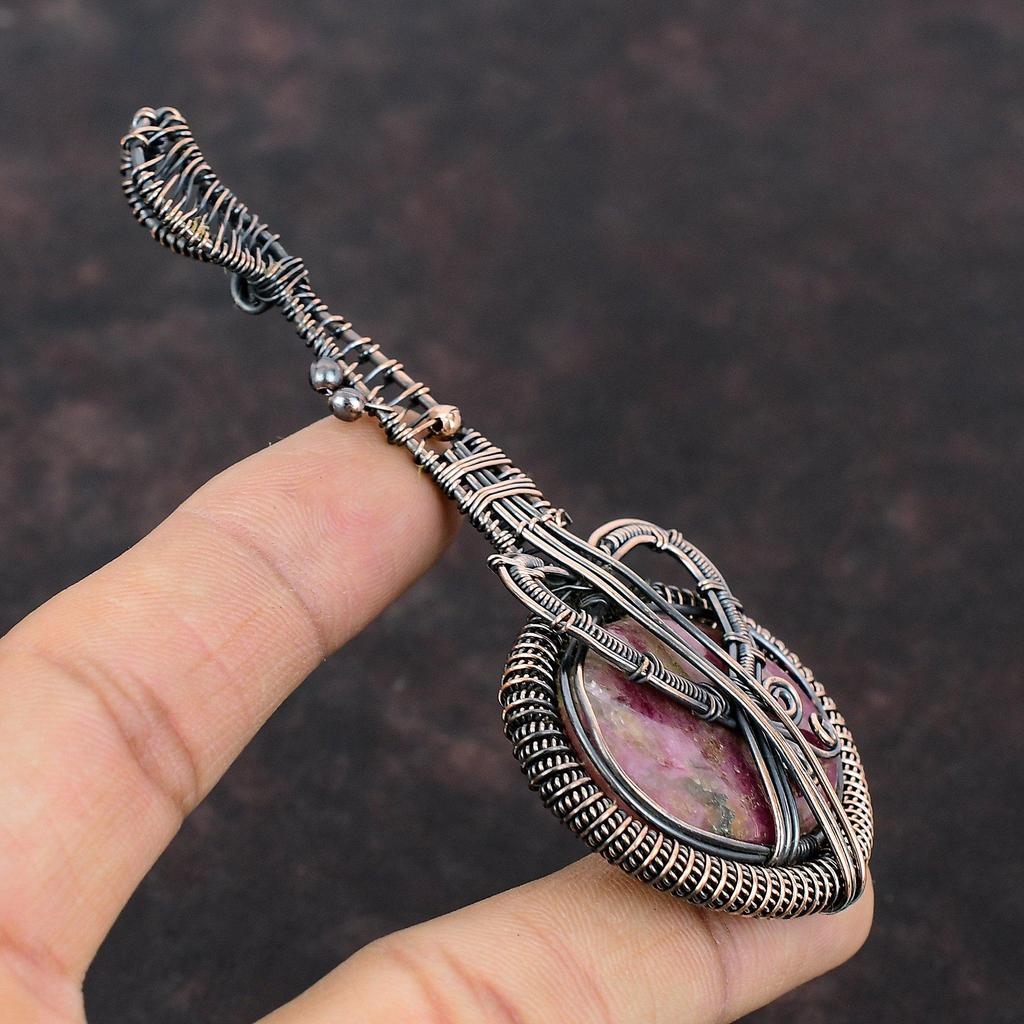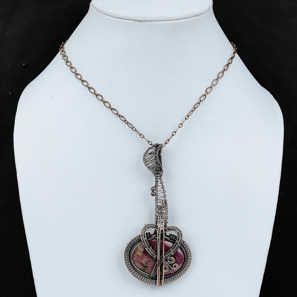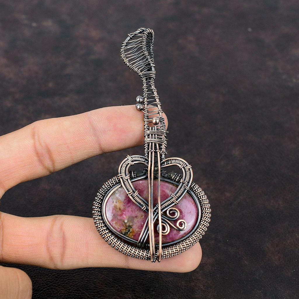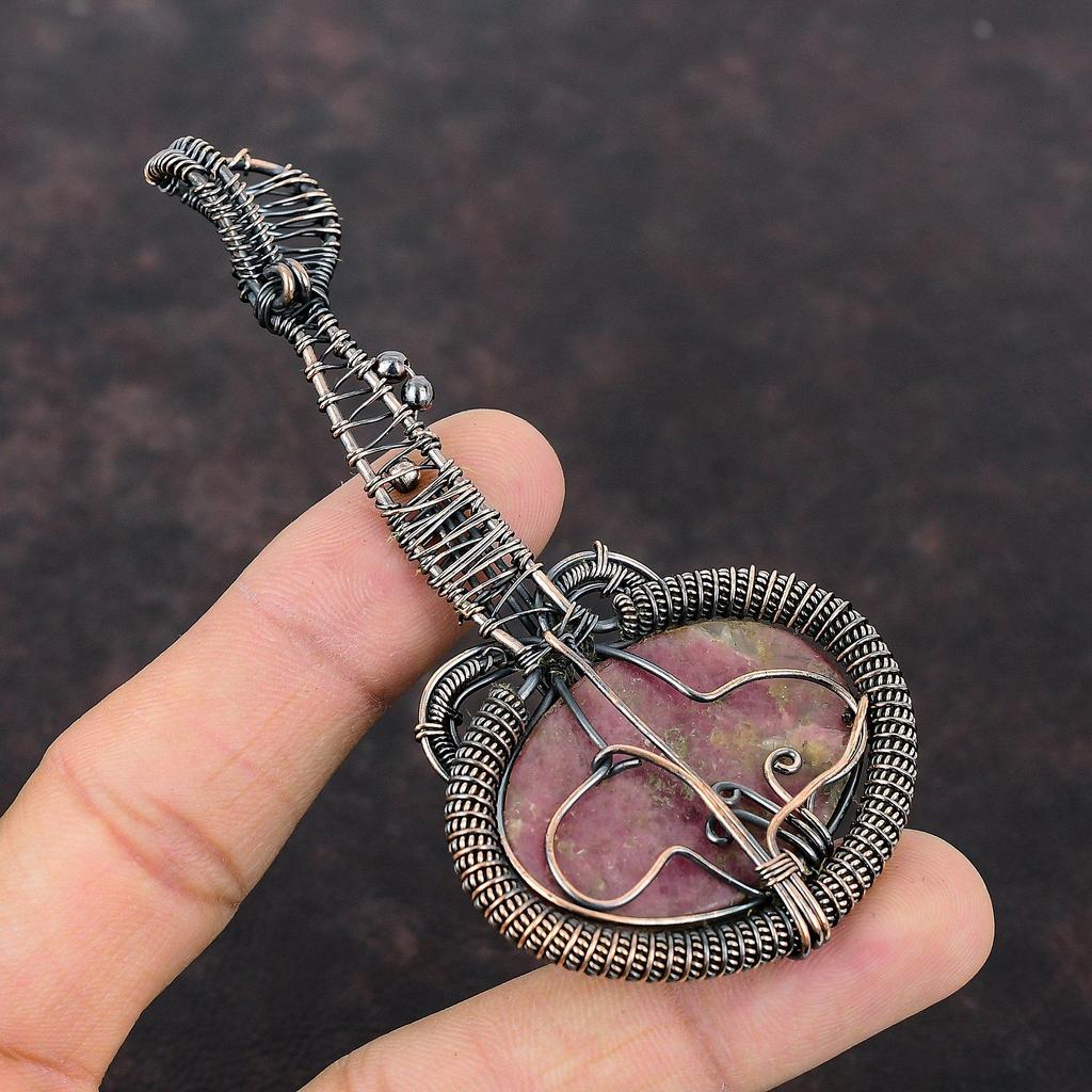 Родонит Медный кулон Медная проволока обернутая ювелирное изделие Драгоценный камень кулон Медная проволока обернутая кулон ручной работы гитара ювелирное изделие подарок для нее