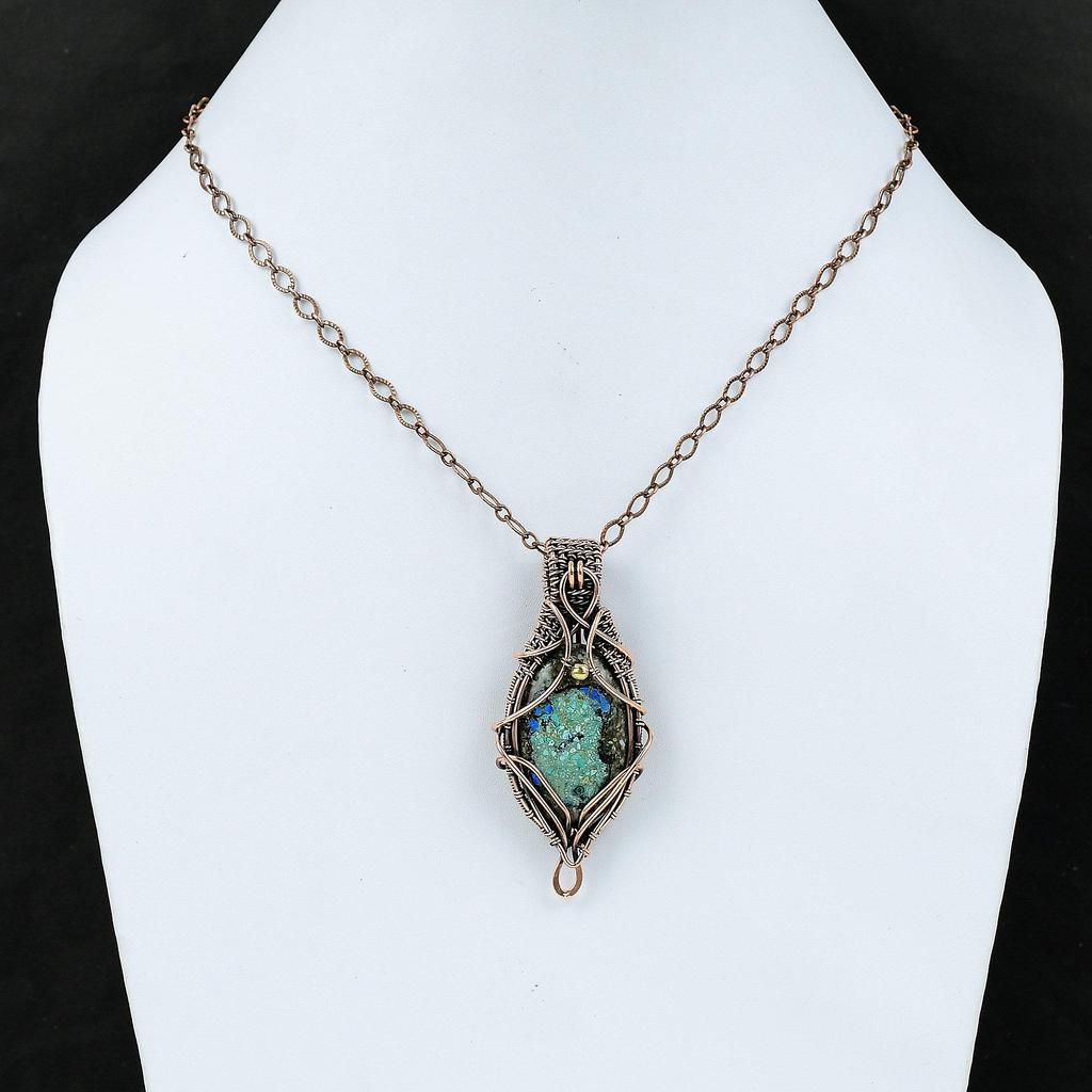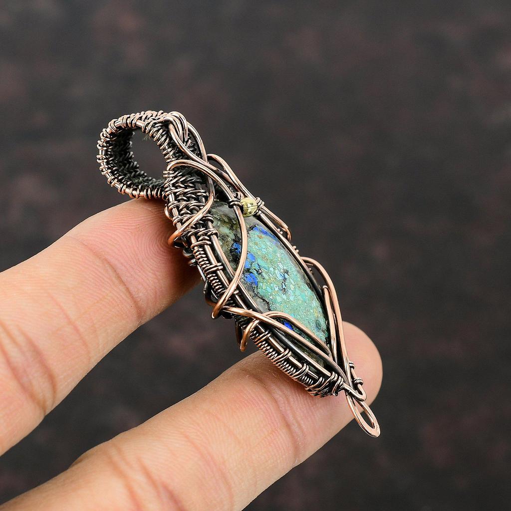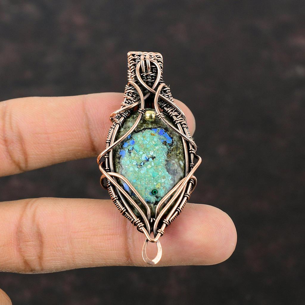 Подвеска из азурита-малахита, обмотанная медной проволокой, подвеска из драгоценного камня, медные украшения, подвеска ручной работы, подарок для нее, украшения из азурита-малахита