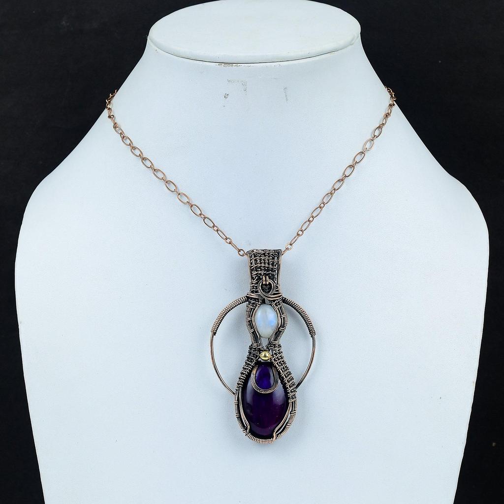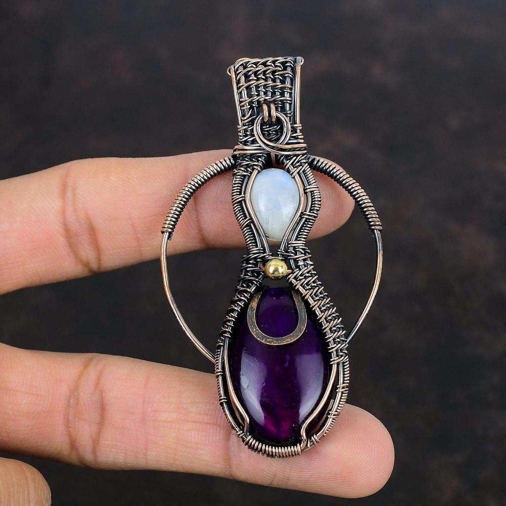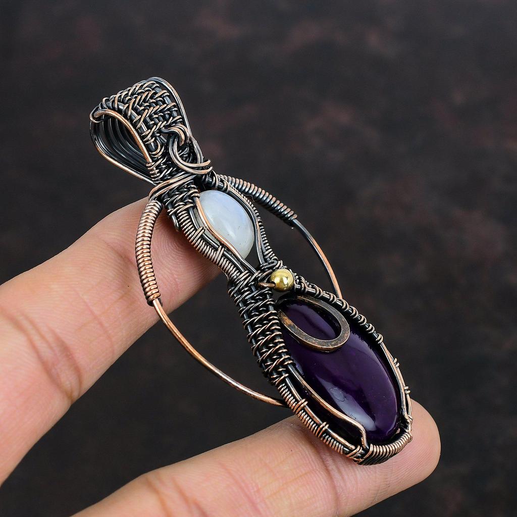 Кулон из фиолетового огненного лабрадорита, медная проволока, ювелирное изделие ручной работы, кулон из радужного лунного камня, драгоценный камень, медное ювелирное изделие, подарок для жены