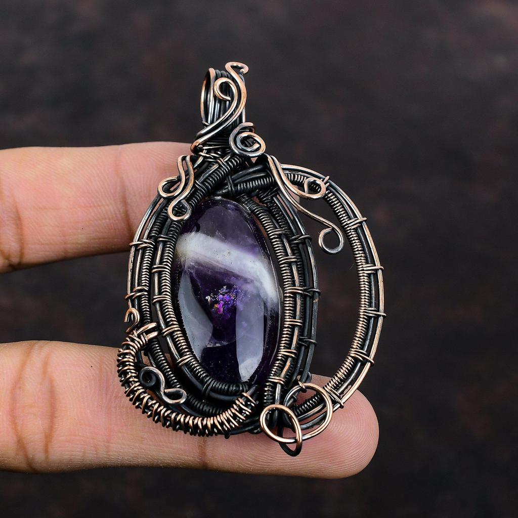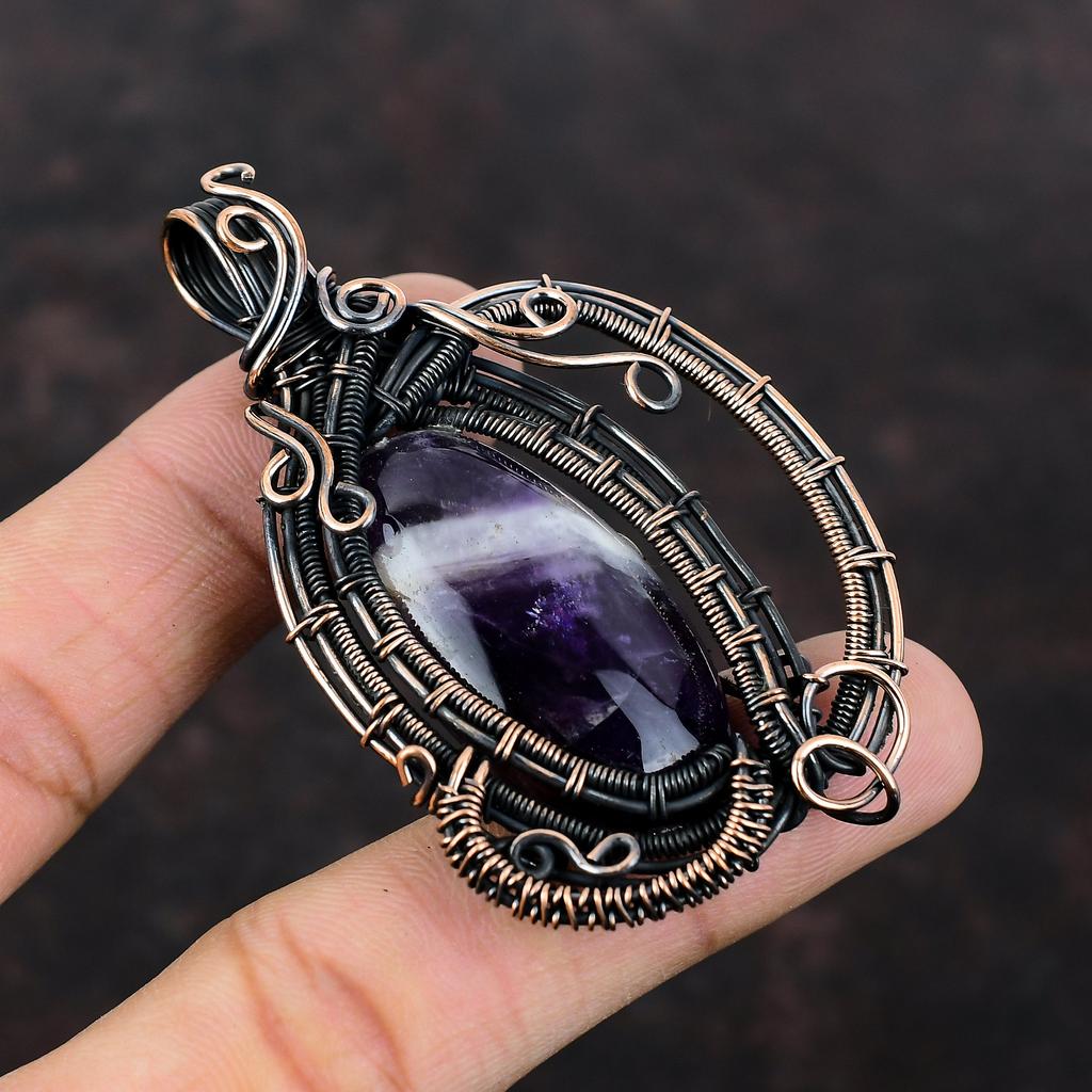 Подвеска с аметистом в виде шеврона, подвеска из медной проволоки с драгоценным камнем, подвеска ручной работы, аметист в виде шеврона, медные ювелирные изделия, этническая подвеска, подарок для женщин