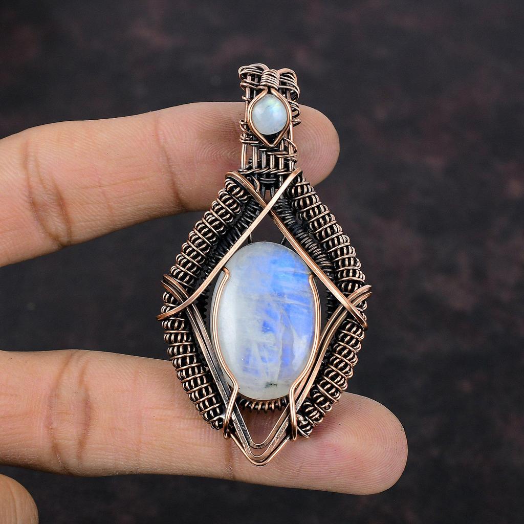 Радужный кулон с лунным камнем, медная проволока, кулон с драгоценным камнем, дизайнерский кулон, ювелирные изделия из лунного камня, кулон ручной работы, медные украшения для подарка