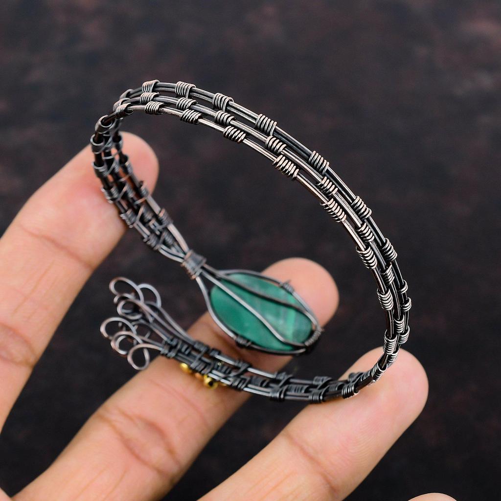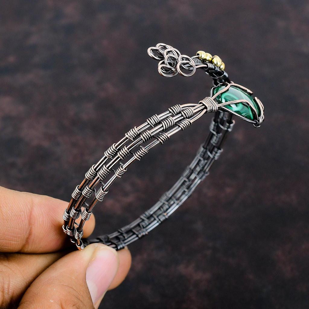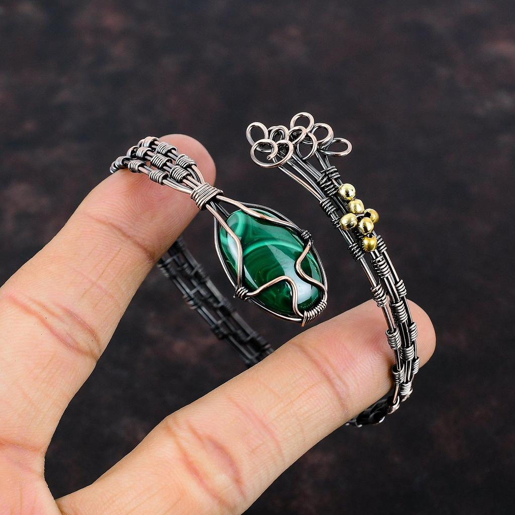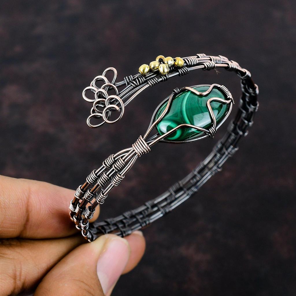Браслет-манжета с малахитом, медная проволока, регулируемый браслет, браслет-манжета ручной работы, браслет из натурального драгоценного камня, медные украшения, подарок для мамы