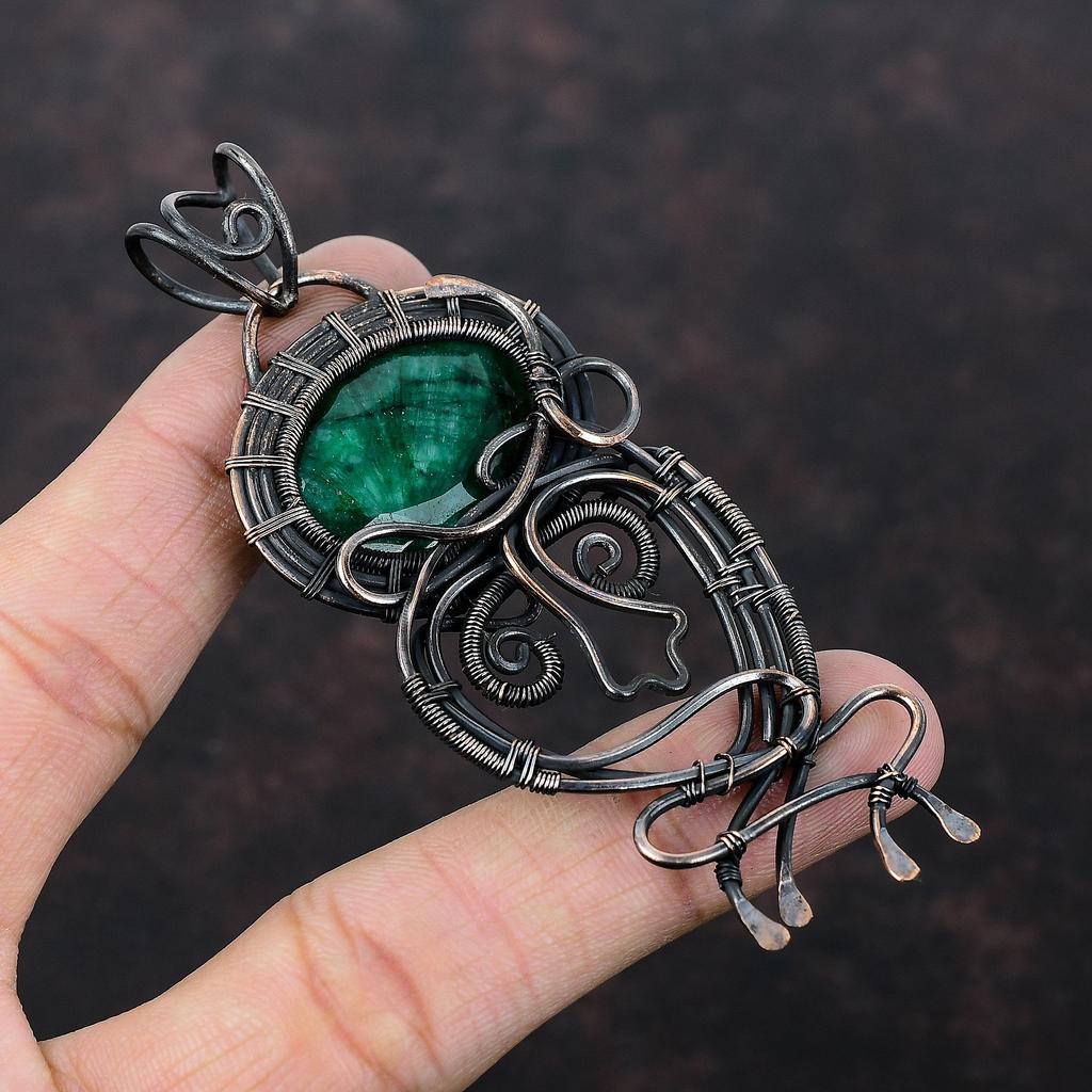 Ограненный замбийский изумруд, медный кулон, медная проволока, кулон с драгоценным камнем, медные украшения ручной работы, подарок на помолвку, изящные ювелирные изделия из проволочной обмотки